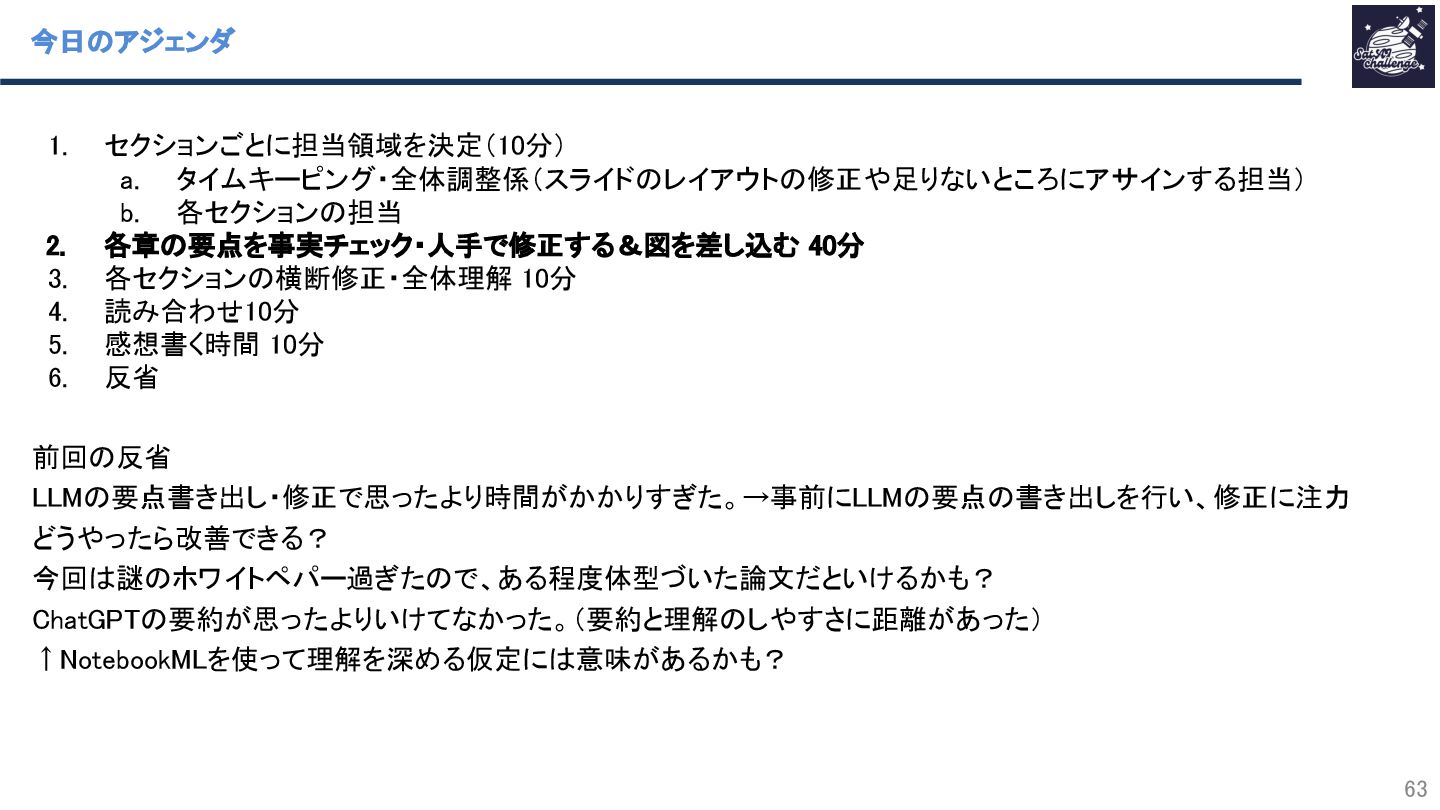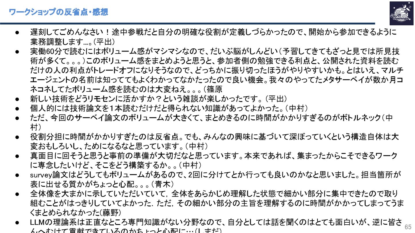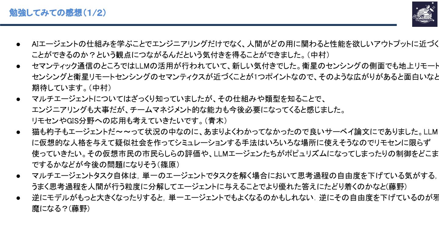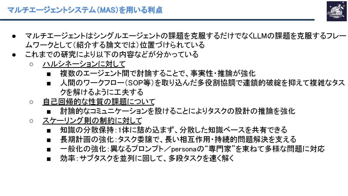 や幻覚が発生すると連鎖して複雑なタスクで破綻(MetaGPT) ▪ 上記の性質を利用して、エージェントを攻撃する恐れがある ◦ 熟考・探索が“自己反省”だと行き詰まる ▪ self-reflection型の反復は、いったんモデルが自分の解に確信すると、間違っていても新しい 考えを出せなくなる 論理矛盾・厳格 ↑1回幻覚が起き ると抜け出せない Justin Chih-Yao Chen et al. (2024), “RECONCILE: Round-Table Conference Improves Reasoning via Consensus among Diverse LLMs”, arXiv:2309.13007 より引用 Sirui Hong et al. (2024), “MetaGPT: Meta Programming for A Multi-Agent Collaborative Framework”,arXiv:2308.00352より引用
