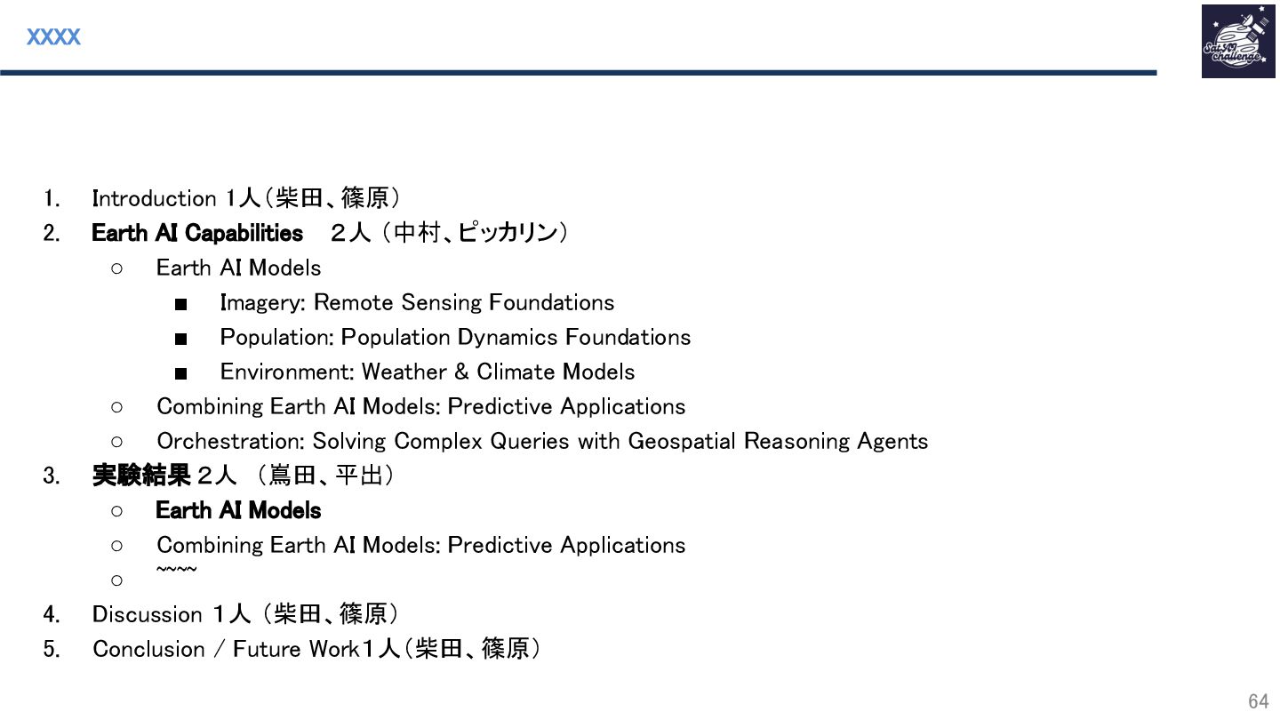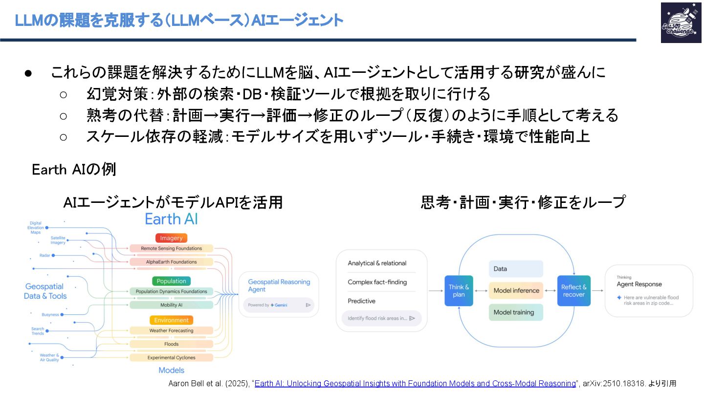 ◦ スケール依存の軽減:モデルサイズを用いずツール・手続き・環境で性能向上 Earth AIの例 AIエージェントがモデルAPIを活用 思考・計画・実行・修正をループ Aaron Bell et al. (2025), “Earth AI: Unlocking Geospatial Insights with Foundation Models and Cross-Modal Reasoning”, arXiv:2510.18318. より引用