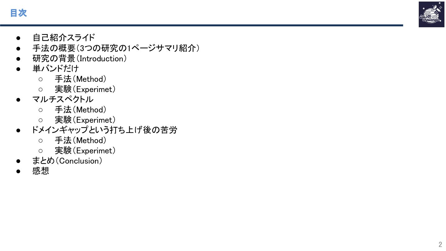 SatAI.challengeは、リモートセンシング技術にAIを適用した論文の調査や、より俯瞰した技術トレンドの調査や国際学会のメタサーベイを行う研究グループです。speakerdeckではSatAI.challenge内での勉強会で使用した資料をWeb上で共有しています。