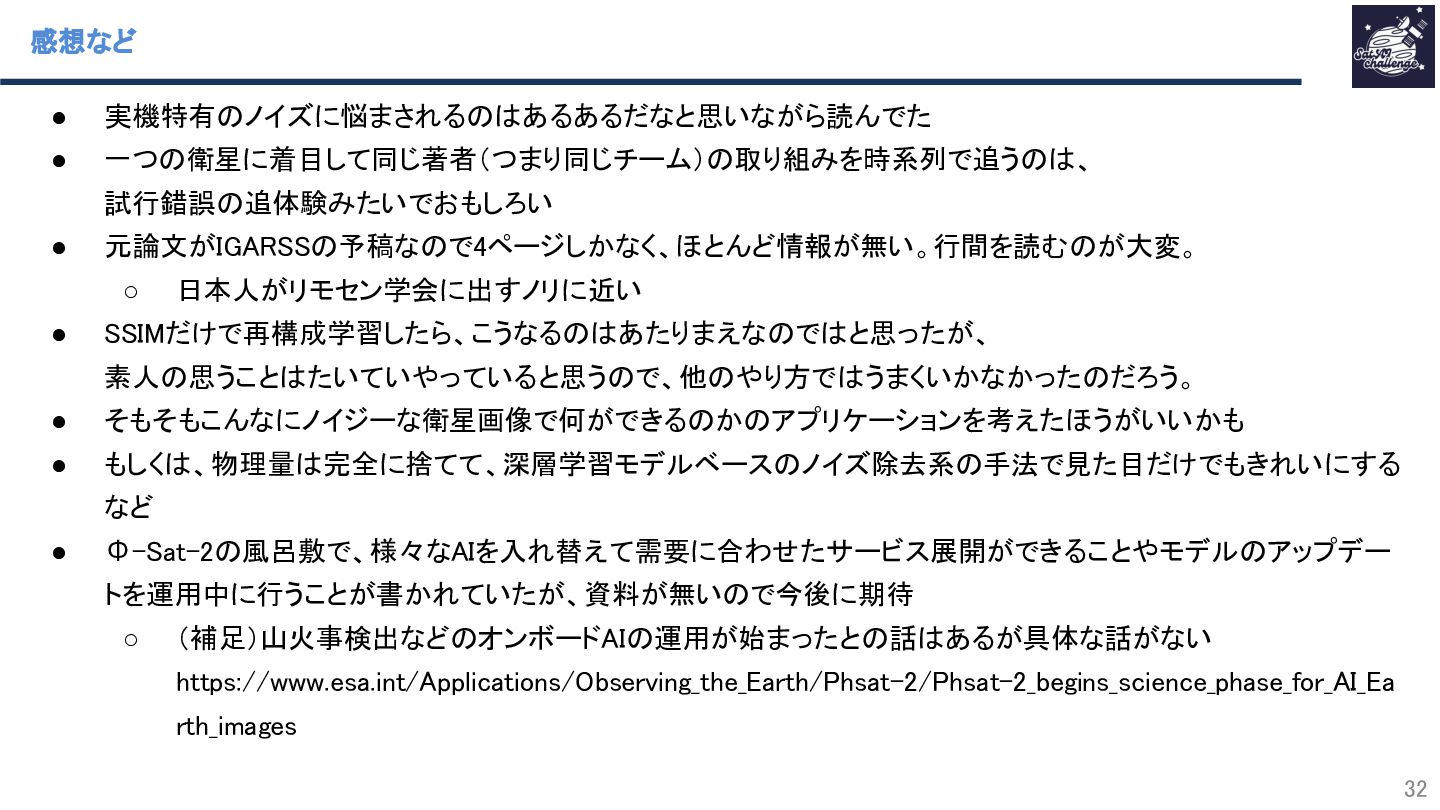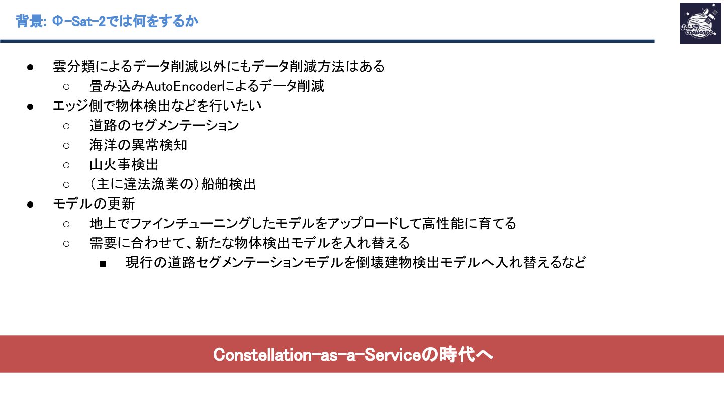 • Φ-Sat-2の風呂敷で、様々なAIを入れ替えて需要に合わせたサービス展開ができることやモデルのアップデー トを運用中に行うことが書かれていたが、資料が無いので今後に期待