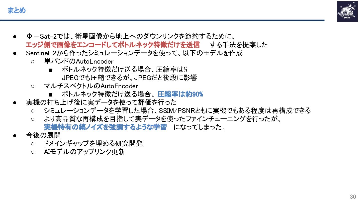 本研究は、小型衛星の観測データを地上に送るデータ量を削減するために、AutoEncoderを用いたボトルネック特徴だけを地上へ送る手法です。1バンドごとにAutoEncoderを適用する手法や、マルチバンドを一度にAutoEncoderに入力するモデルを疑似的なΦ-Sat-2データで学習して、再構成の質や下流タスクへの適用性を評価しました。そして、打ち上げ語のΦ-Sat-2データにモデルを適用しました。