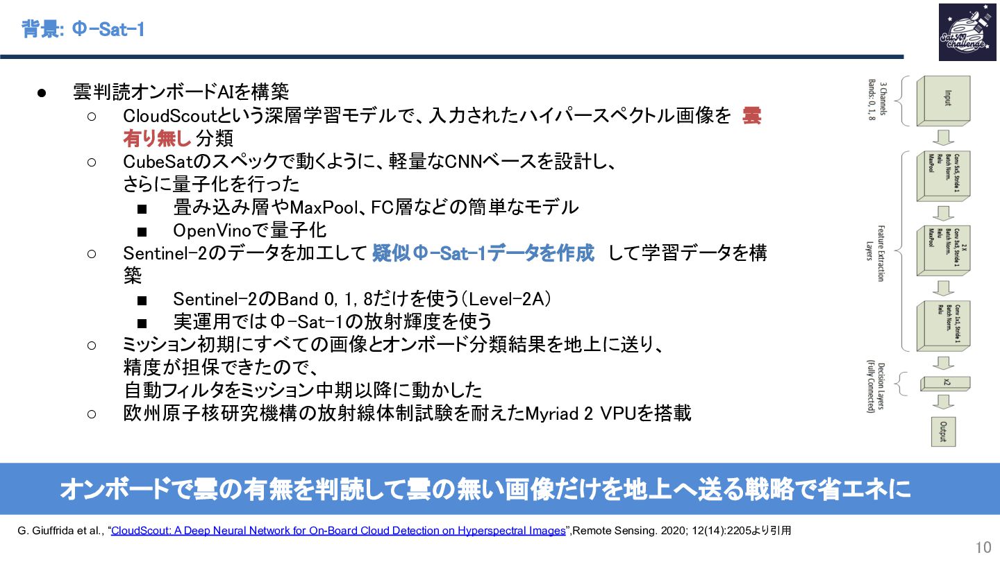 ◦ CloudScoutという深層学習モデルで、入力されたハイパースペクトル画像を 雲 有り無し 分類