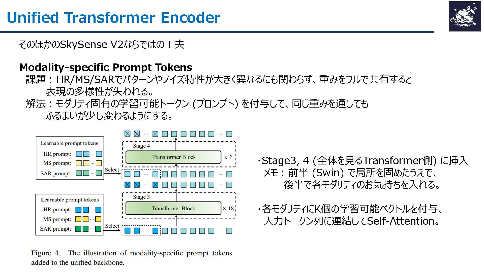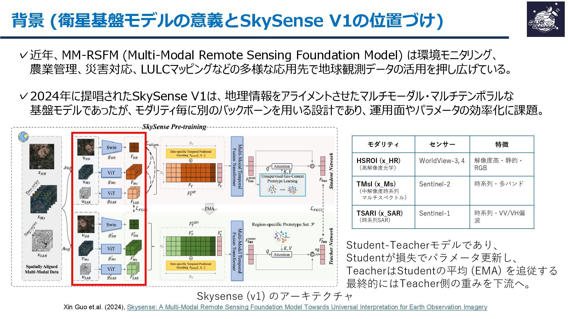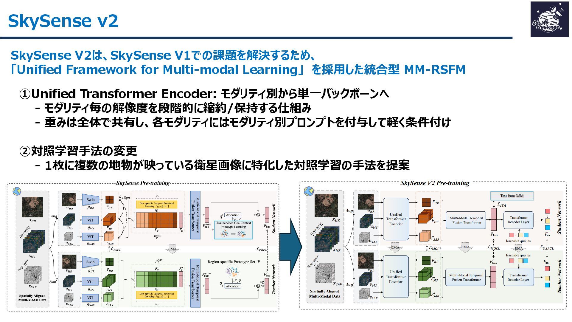 紹介する論文は、「SkySense V2: A Unified Foundation Model for Multi-modal Remote Sensing」です。本研究では、高・中空間分解能の光学衛星画像およびSAR衛星画像を、単一のTransformerバックボーンで統合的に処理する基盤モデルを提案しました。従来はモダリティごとに別バックボーンを用いる設計が主流で、パラメータ冗長性やモデル肥大化が課題でした。SkySense V2では、Adaptive Patch Mergingやモダリティプロンプトなどの工夫により、複数解像度・複数モダリティを一体的に扱うことを可能にしています。