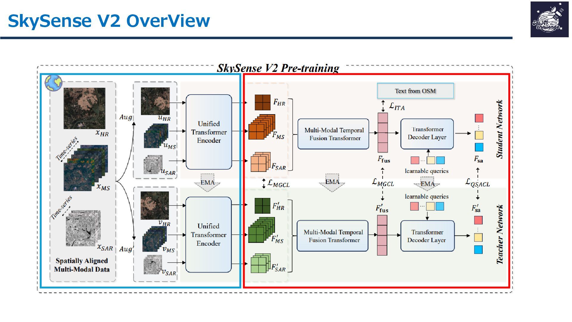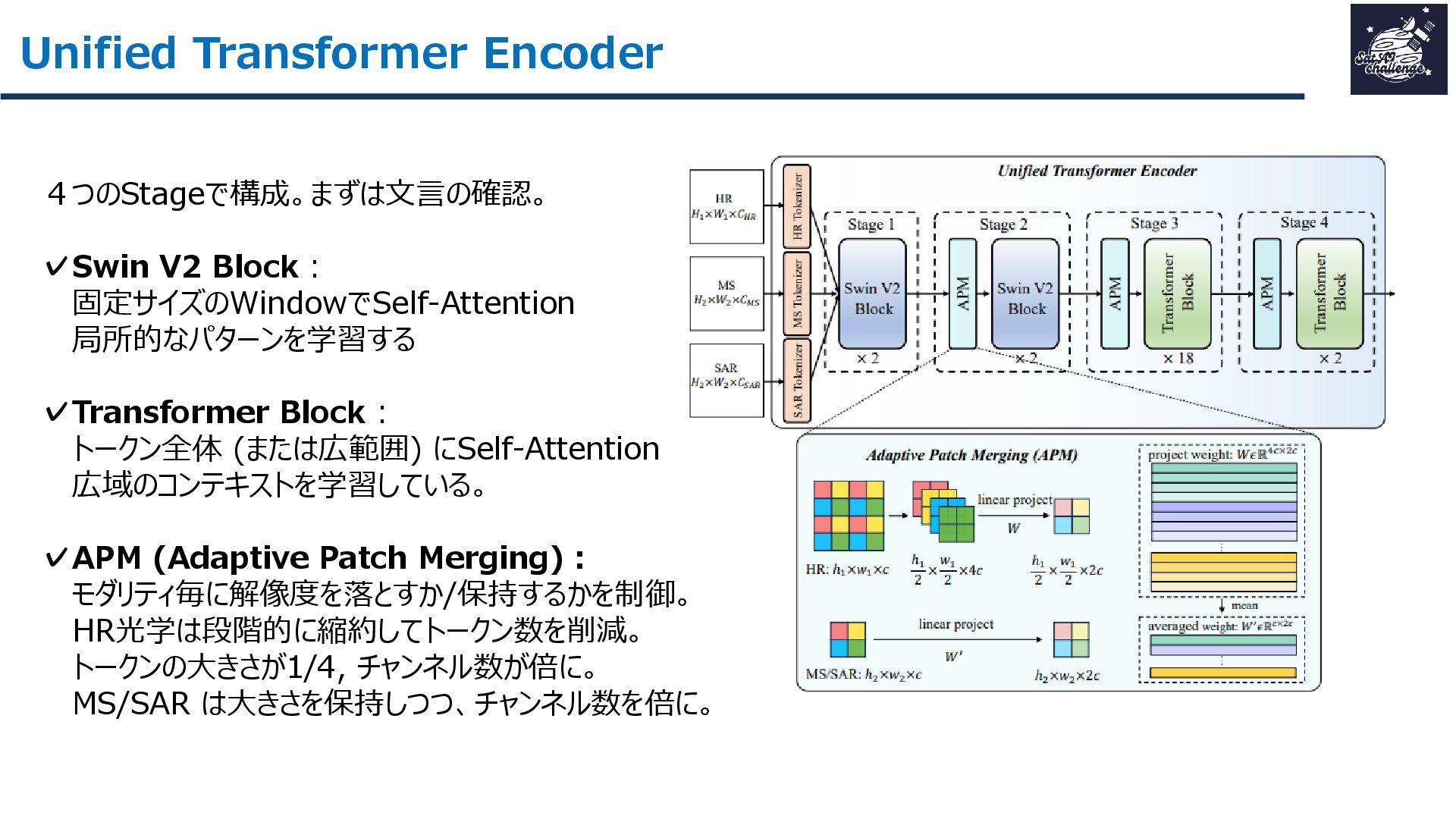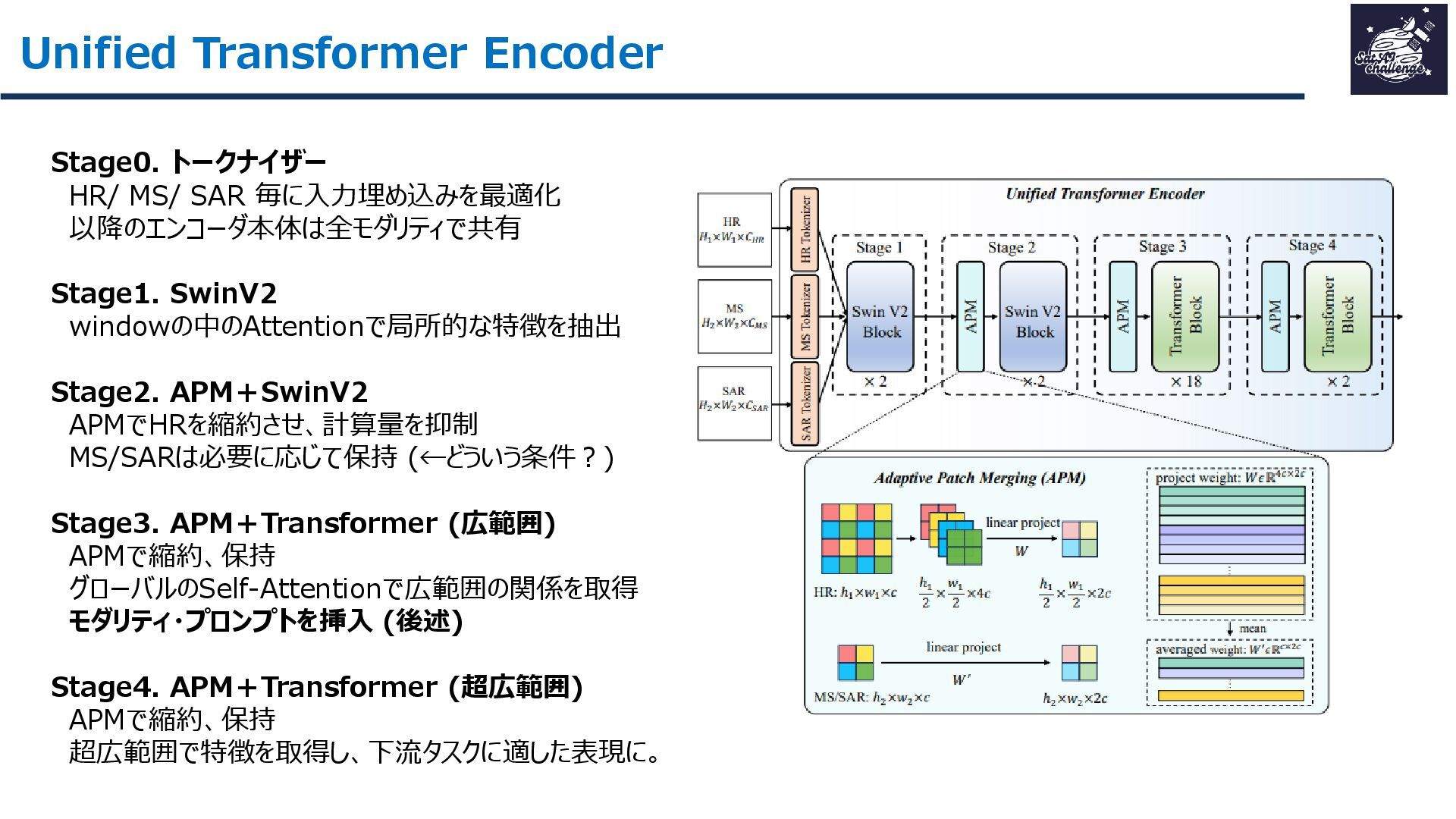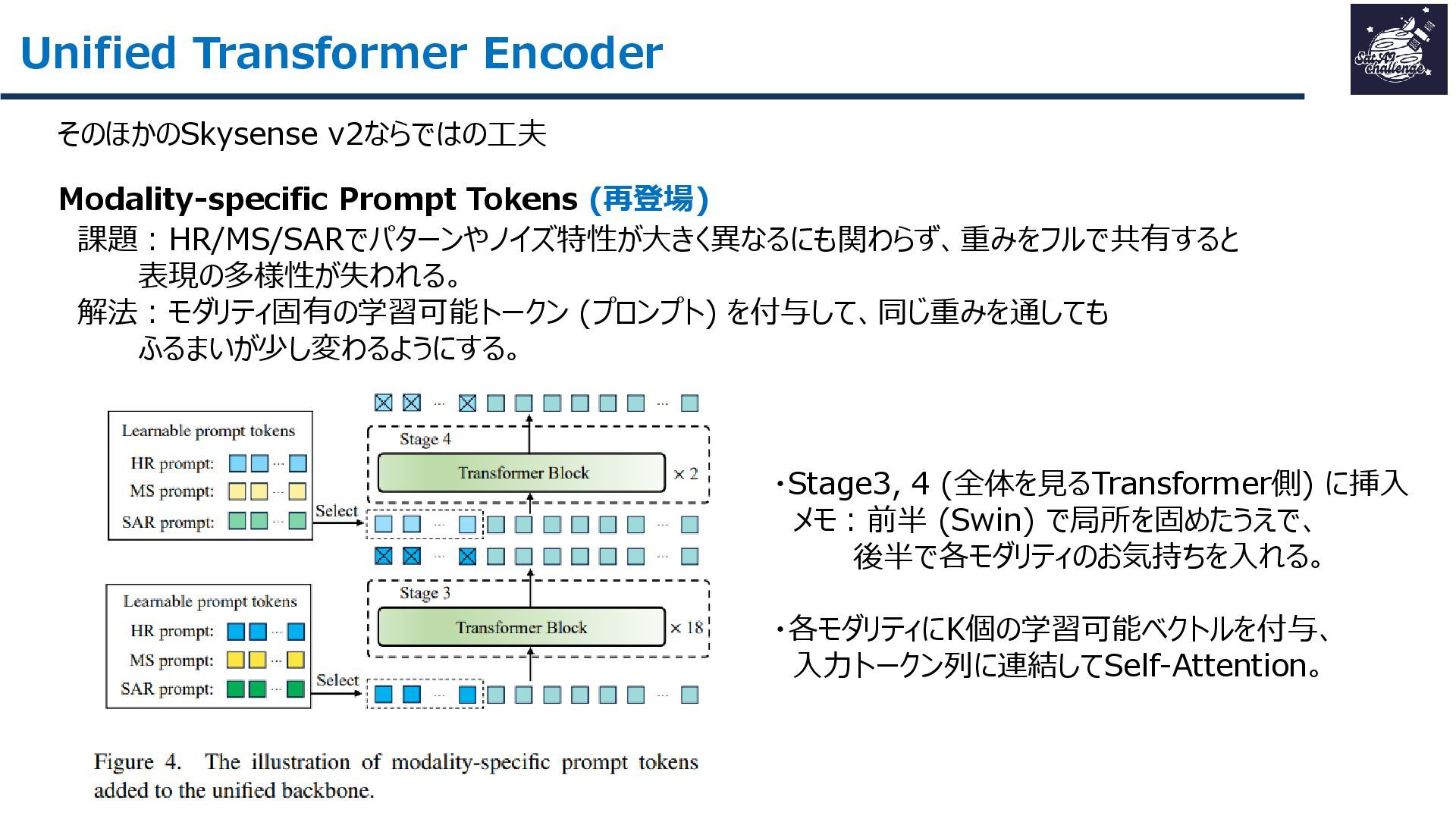 紹介する論文は、「SkySense V2: A Unified Foundation Model for Multi-modal Remote Sensing」です。本研究では、高・中空間分解能の光学衛星画像およびSAR衛星画像を、単一のTransformerバックボーンで統合的に処理する基盤モデルを提案しました。従来はモダリティごとに別バックボーンを用いる設計が主流で、パラメータ冗長性やモデル肥大化が課題でした。SkySense V2では、Adaptive Patch Mergingやモダリティプロンプトなどの工夫により、複数解像度・複数モダリティを一体的に扱うことを可能にしています。