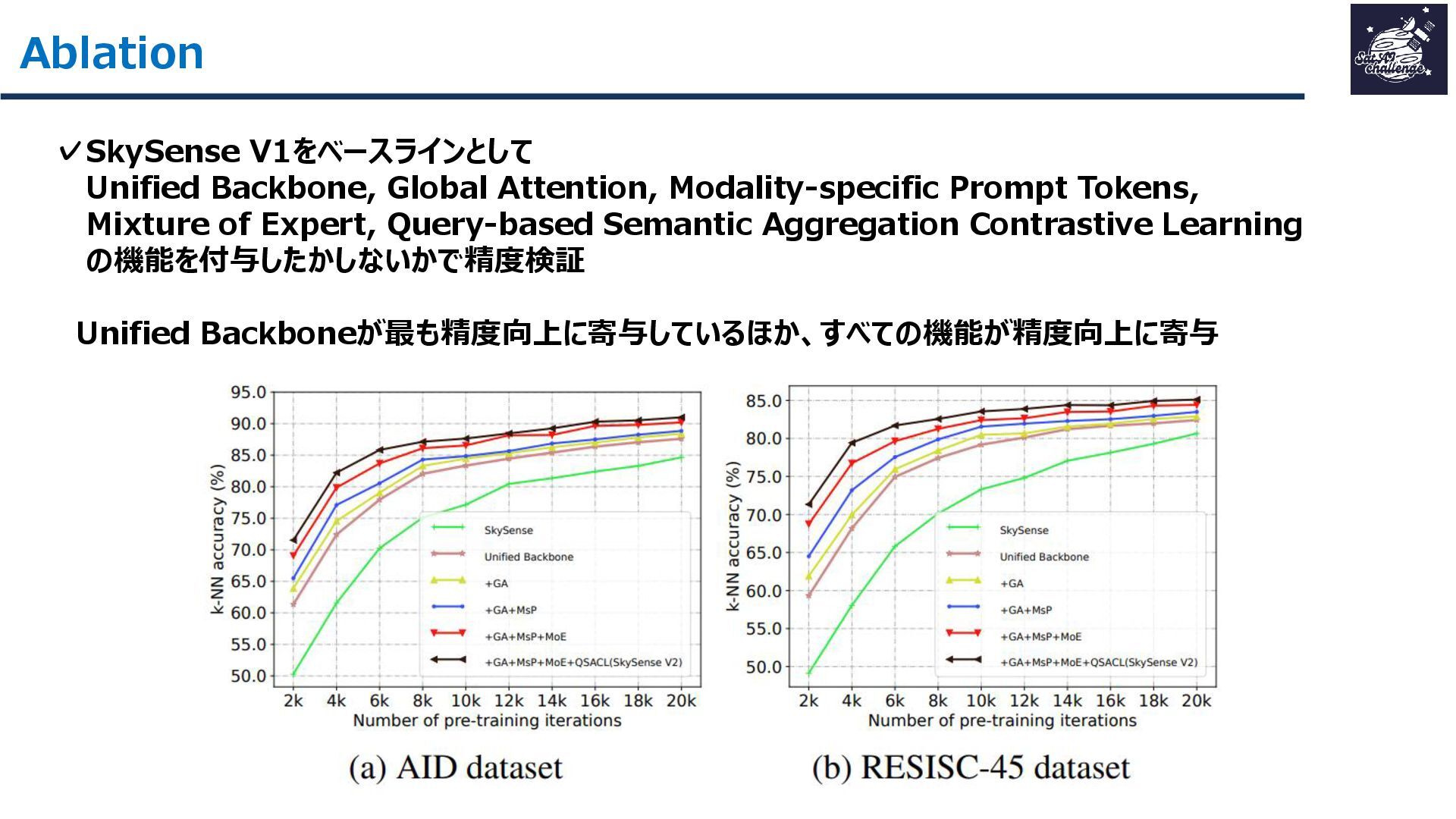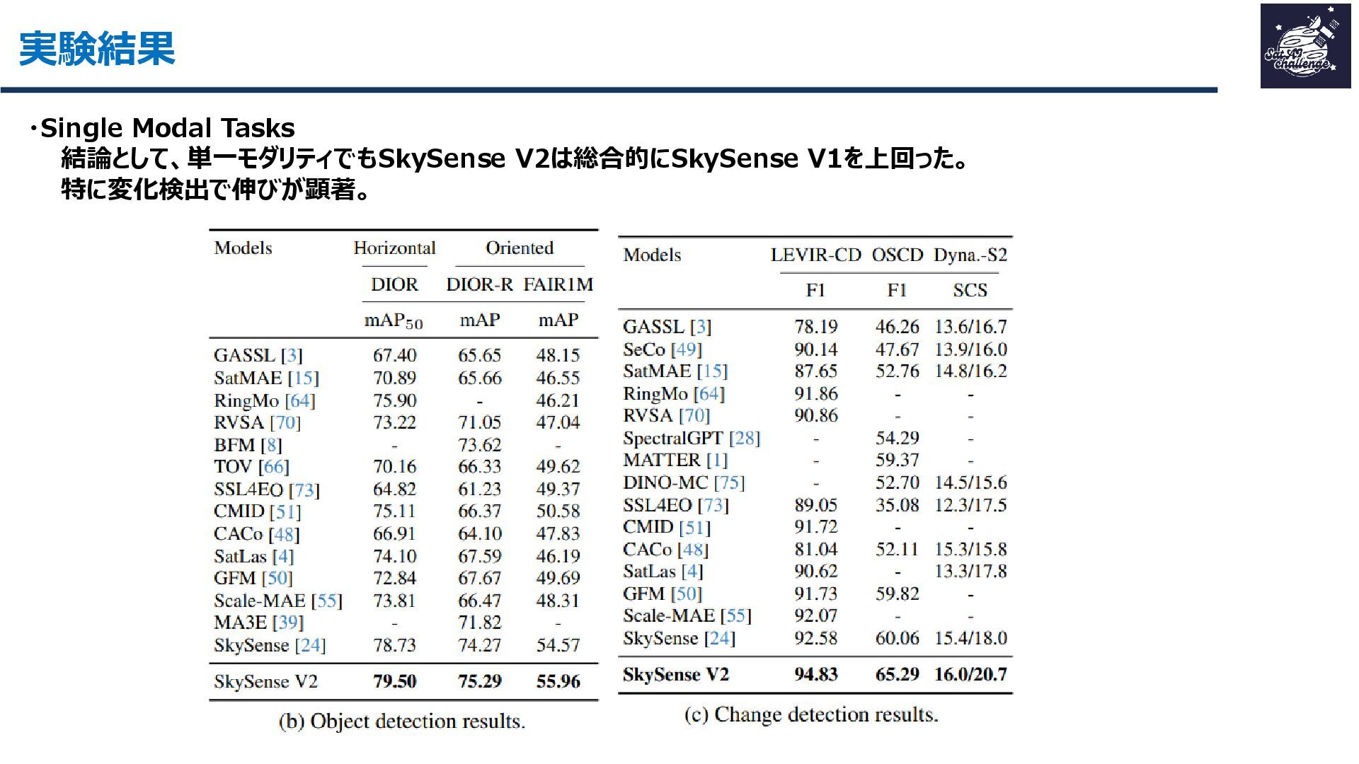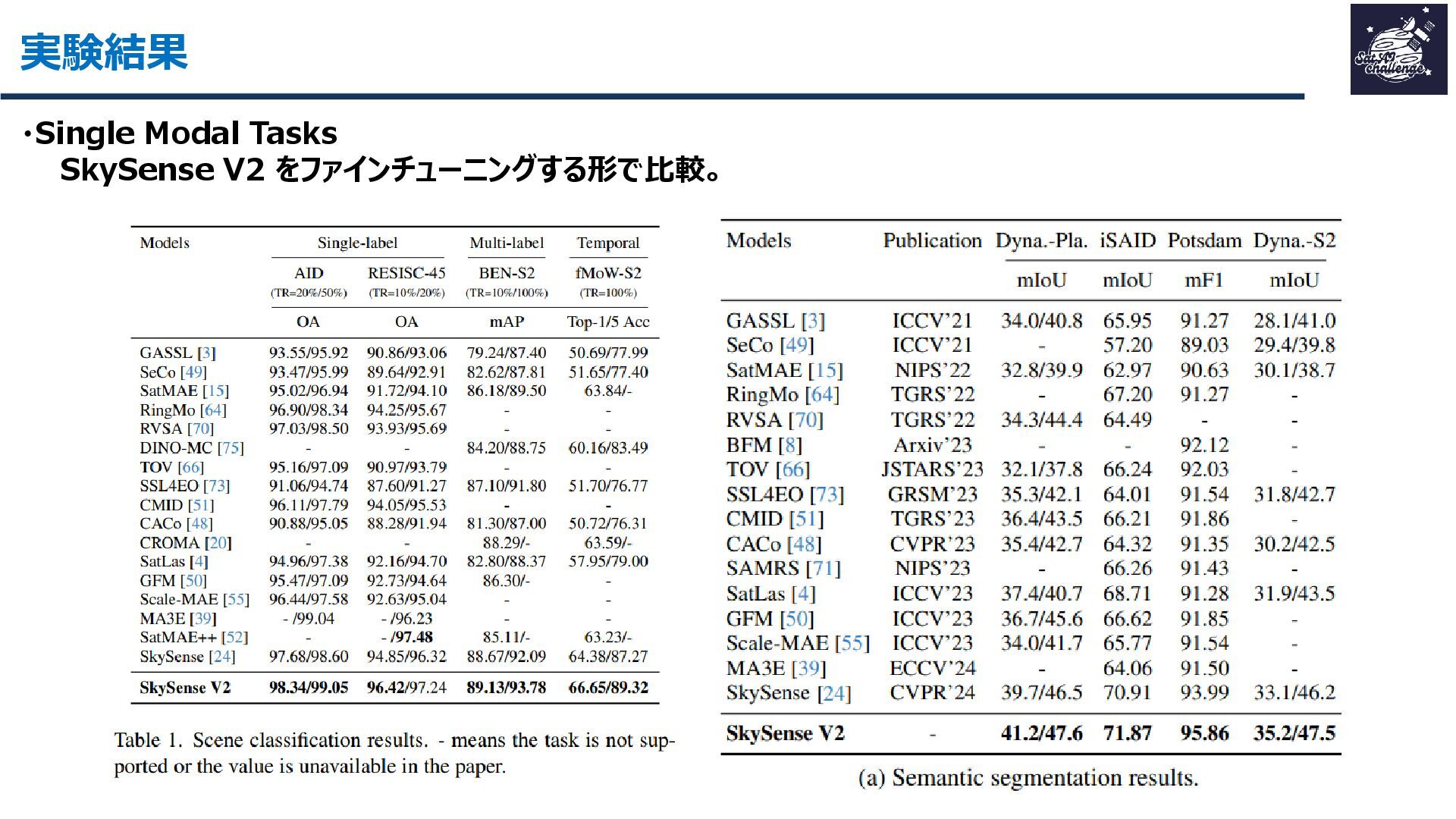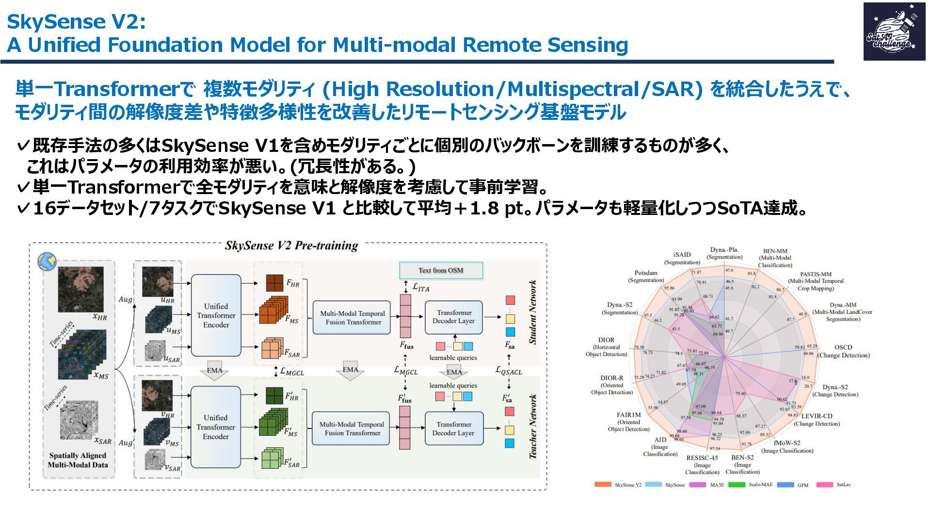 その結果、16データセット・7タスクで平均+1.8ptの性能向上を達成し、軽量かつ汎用的なリモートセンシング基盤モデルとして有効性を示しました。