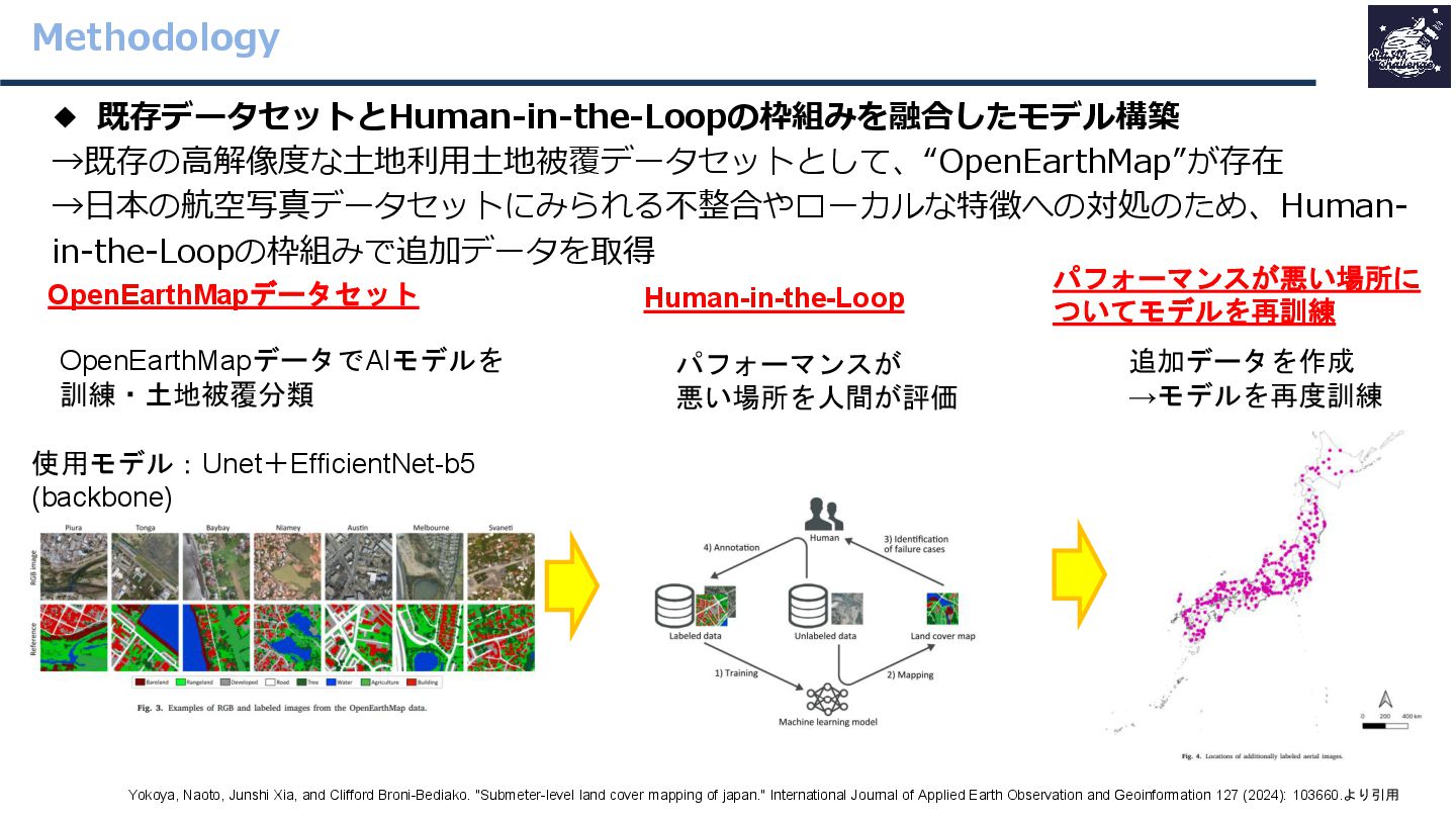 紹介する論文は「Submeter-level land cover mapping of Japan」です。この研究では、航空写真のアーカイブデータに対して深層学習の手法を適用し、1 m未満の空間解像度で作成した土地被覆分類図について述べられています。具体的には、OpenEarthMapという既存の高解像度な土地被覆分類のためのデータセットを使用し、Unet とEfficientNetで構成される深層学習モデルを訓練します。次に、最初のモデルでは土地被覆分類精度が悪かった場所をエキスパートが評価し、追加データを作成したうえで改めてモデルを訓練しました。この結果として得られた土地被覆分類図は全国を網羅的にカバーするとともに、既存の建物や圃場ポリゴンの情報を補完する可能性など、様々なユースケースの展開が考えられます。
