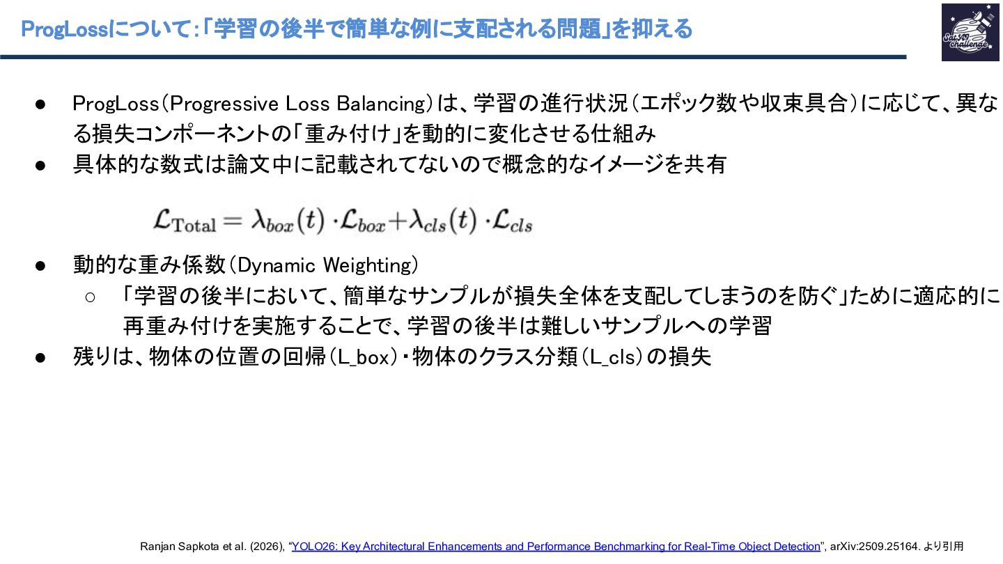 が計算時間と実利用に置いてボトルネックになっていました。そこで、この論文ではProgLoss(学習が進む毎に難しいサンプルへ重みを上げる)、AL(小物体へラベル割り当て工夫)、MuGD(学習収束を早くする工夫)を用いて、計算度と性能維持を超えて性能の改善を行なっています。実験結果ではCOCOデータセットで計算時間・精度で高い性能を示しました。