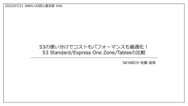 テーブルバケット • テーブル単位で管理…オブジェクト がマネージドに管理される • 主な料金 • ストレージ • USD 0.025/1,000 オブジェクト(モニタリング、 全ストレージ/月) • USD 0.0288/GB(最初の 50 TB/月) • USD 0.0276/GB(次の 450 TB/月) • USD 0.0265/GB(500 TB/月以上) • リクエスト • PUTリクエスト:USD 0.0047/ 1,000件 • GETリクエスト:USD 0.00037/ 1,000件 • メンテナンス • オブジェクト:USD 0.00185 per 1,000 objects processed • データ処理量:USD 0.005 per GB processed 同 高 高 + メンテナンスコスト S3 Standardの主な料金 ストレージ:USD 0.025/GB(最初の 50 TB/月) リクエスト PUTリクエスト:USD 0.0047/ 1,000件 GETリクエスト:USD 0.00037/ 1,000件