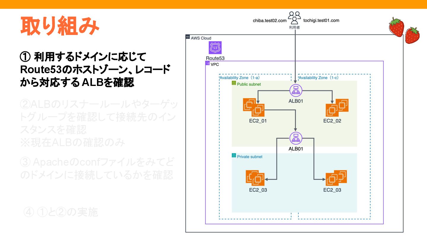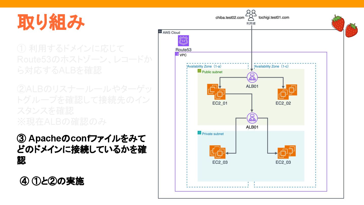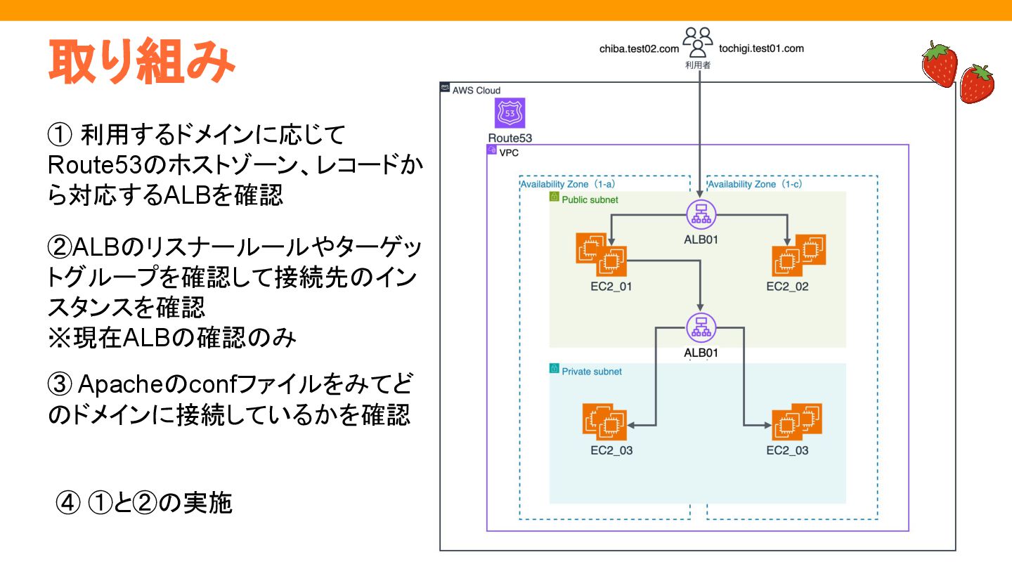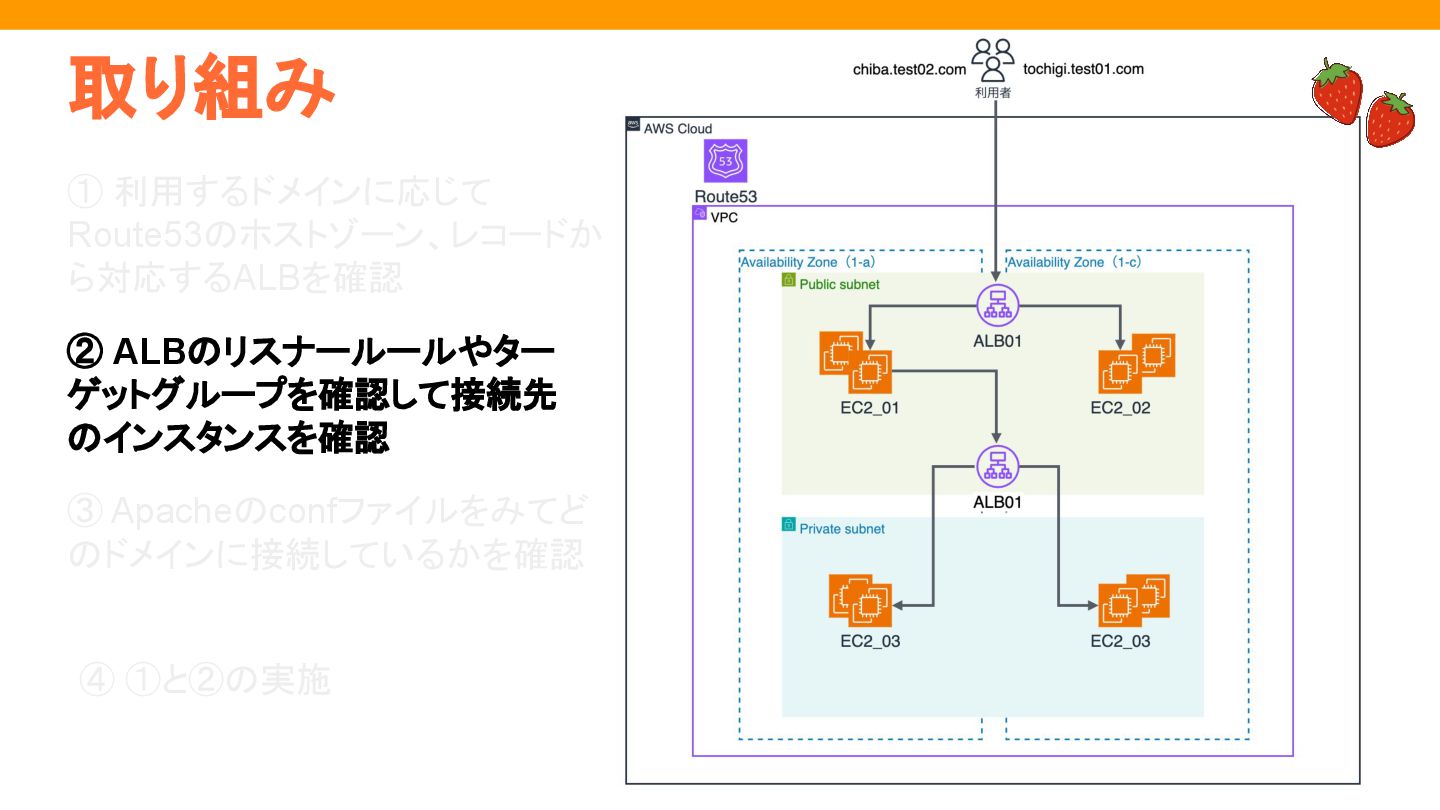 取り組み ① 利用するドメインに応じて Route53のホストゾーン、レコードか ら対応するALBを確認 ②ALBのリスナールールやターゲッ トグループを確認して接続先のイン スタンスを確認 ※現在ALBの確認のみ ③