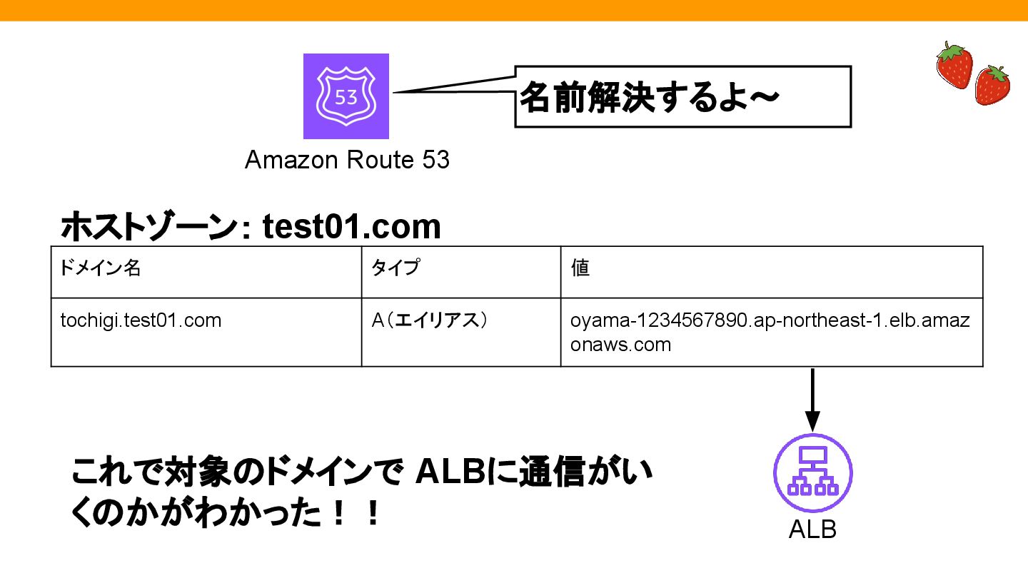 ホストゾーン: test01.com これで対象のドメインで ALBに通信がい くのかがわかった!! ALB 名前解決するよ〜