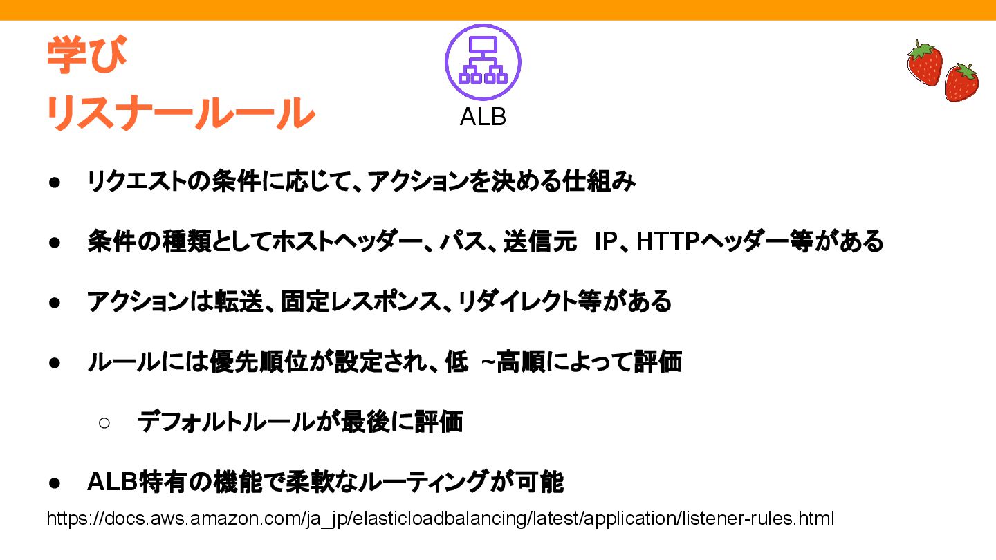 ターゲットグループA リスナールール(パスパターン) 学び リスナールール https://docs.aws.amazon.com/ja_jp/elasticloadbalancing/latest/application/listener-rules.html • リクエストの条件に応じて、アクションを決める仕組み • 条件の種類としてホストヘッダー、パス、送信元 IP、HTTPヘッダー等がある