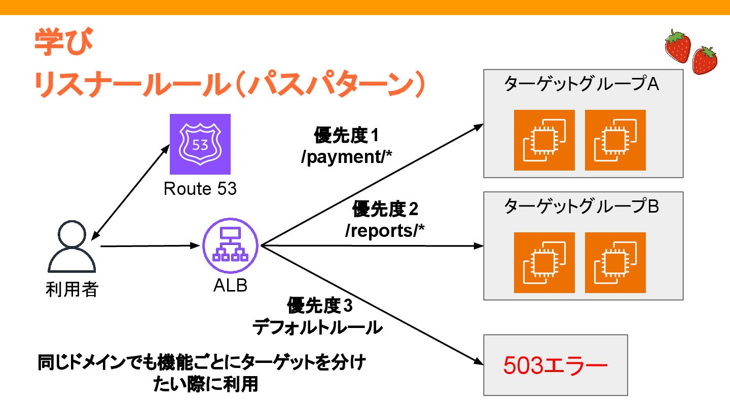 ALB 利用者 ターゲットグループA ターゲットグループB 優先度1 /payment/* 優先度2 /reports/* 学び リスナールール(パスパターン)