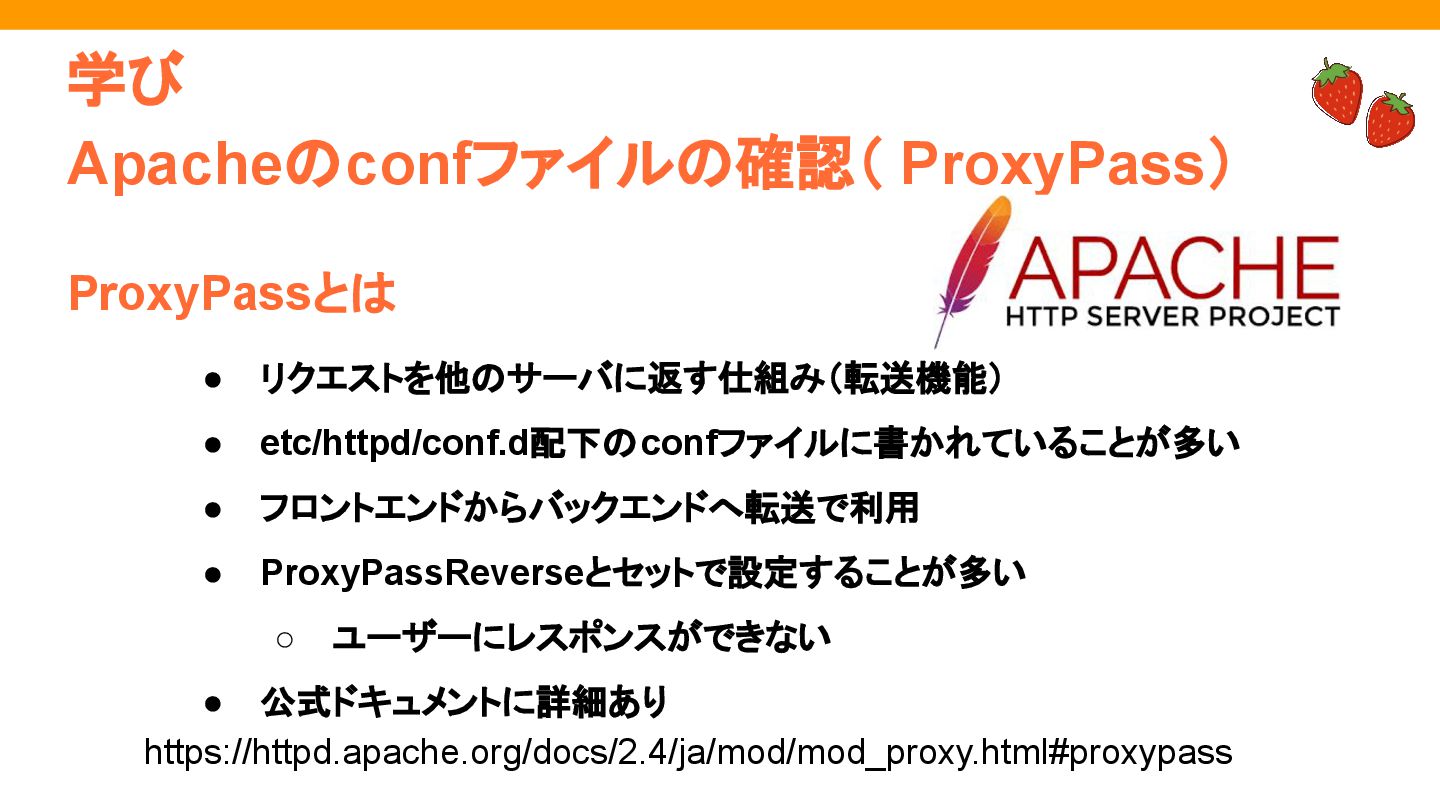 学び Apacheのconfファイルの確認( ProxyPass) ProxyPassとは • リクエストを他のサーバに返す仕組み(転送機能) • etc/httpd/conf.d配下のconfファイルに書かれていることが多い • フロントエンドからバックエンドへ転送で利用