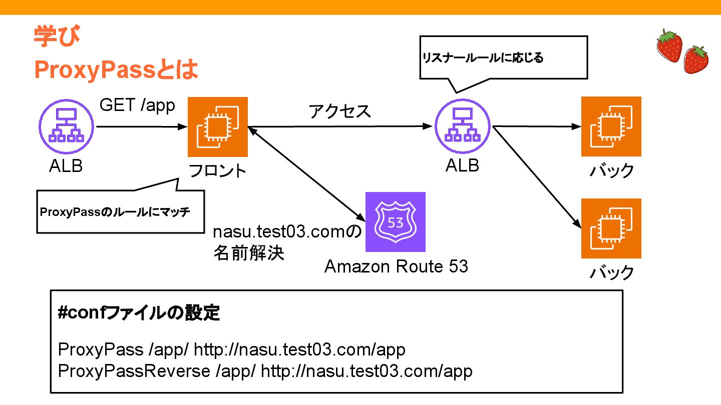 ALB フロント ALB Amazon Route 53 #confファイルの設定 ProxyPass /app/ http://nasu.test03.com/app