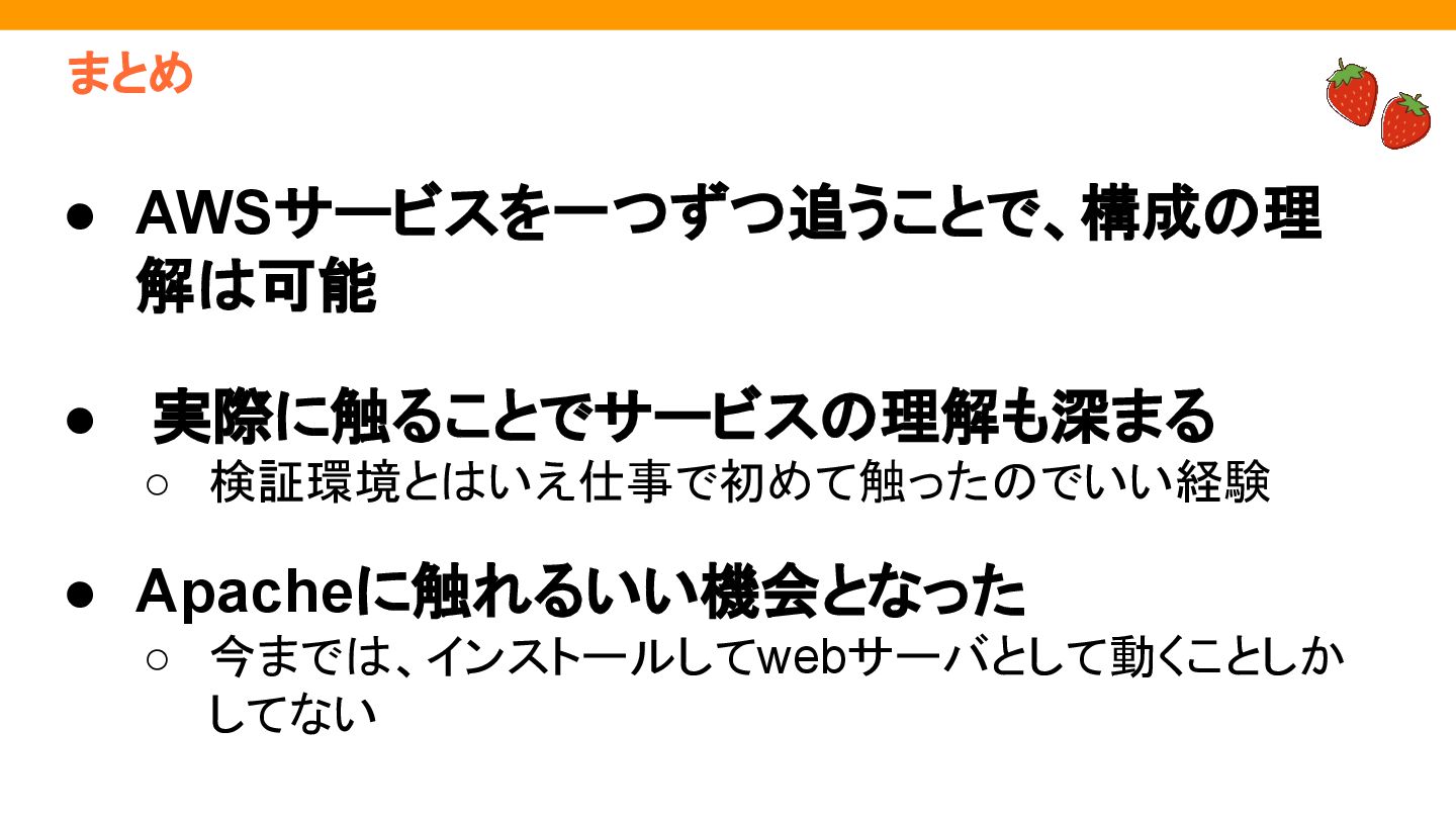 まとめ • AWSサービスを一つずつ追うことで、構成の理 解は可能 • 実際に触ることでサービスの理解も深まる ◦ 検証環境とはいえ仕事で初めて触ったのでいい経験 • Apacheに触れるいい機会となった