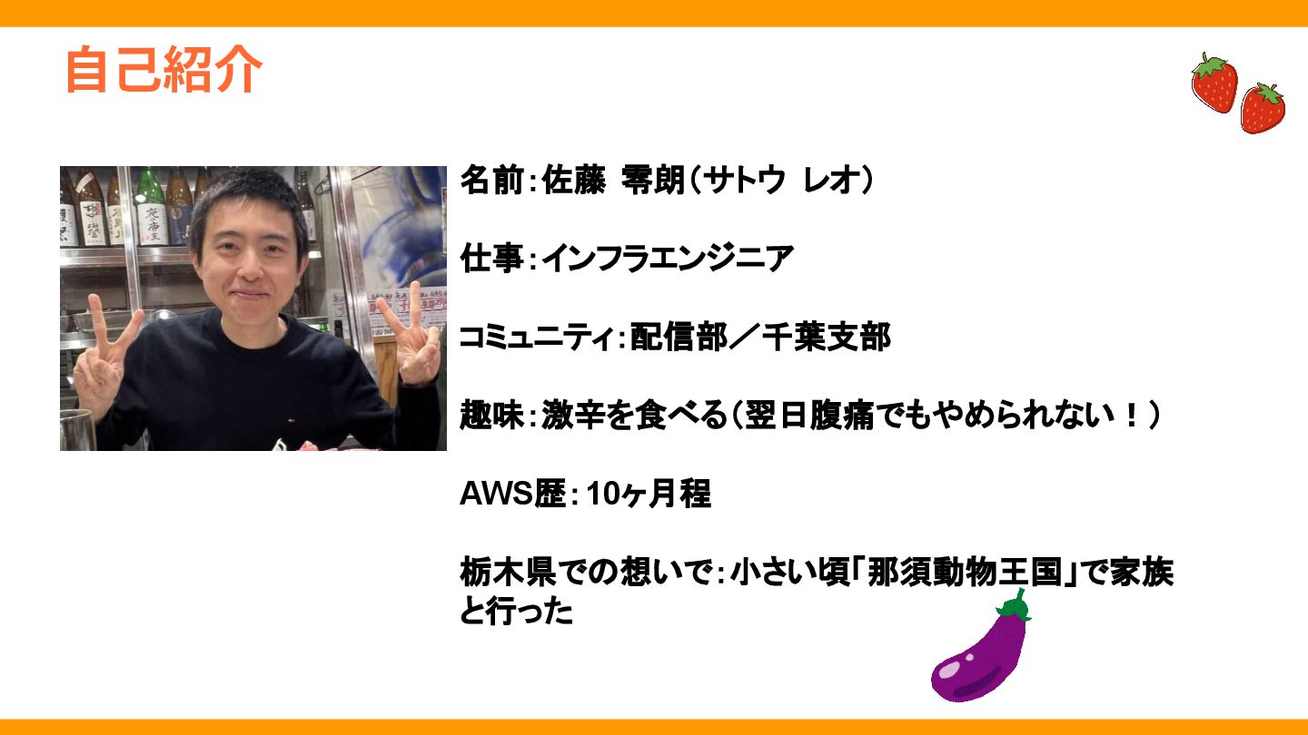 ⾃⼰紹介 名前:佐藤 零朗(サトウ レオ) 仕事:インフラエンジニア コミュニティ:配信部/千葉支部 趣味:激辛を食べる(翌日腹痛でもやめられない!) AWS歴:10ヶ月程 栃木県での想いで:小さい頃「那須動物王国」で家族