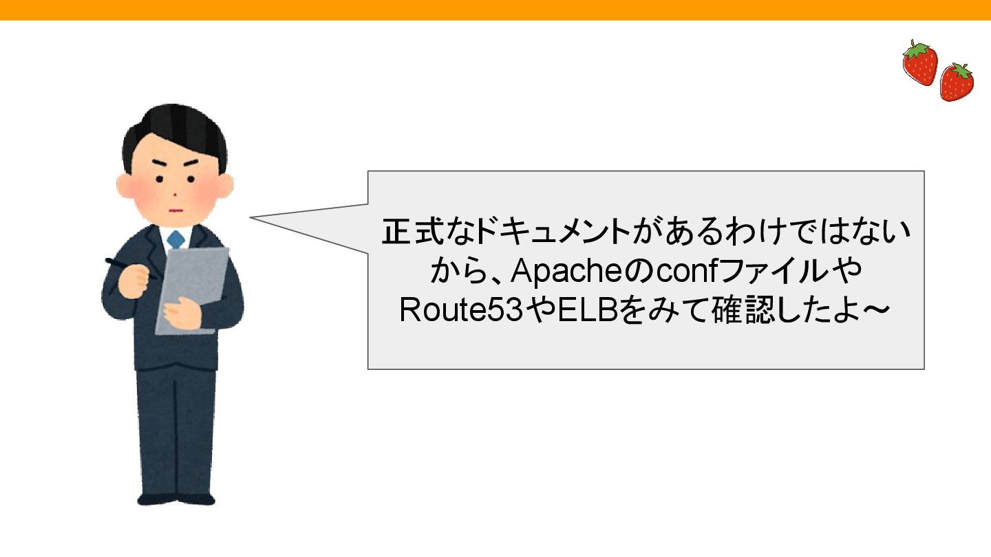 正式なドキュメントがあるわけではない から、Apacheのconfファイルや Route53やELBをみて確認したよ〜