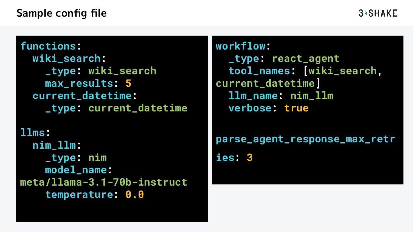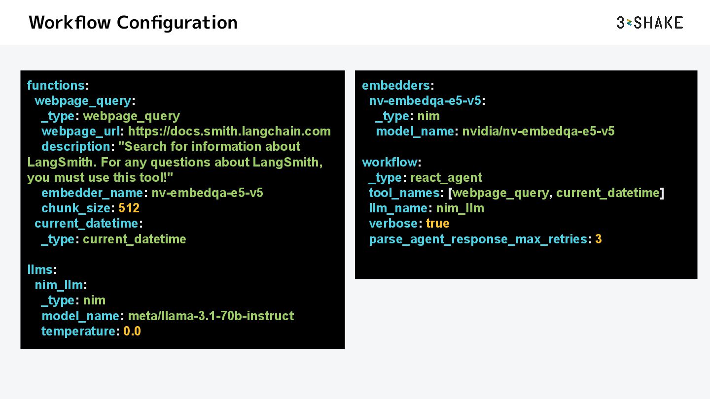 for information about LangSmith. For any questions about LangSmith, you must use this tool!" embedder_name: nv-embedqa-e5-v5 chunk_size: 512 current_datetime: _type: current_datetime llms: nim_llm: _type: nim model_name: meta/llama-3.1-70b-instruct temperature: 0.0 embedders: nv-embedqa-e5-v5: _type: nim model_name: nvidia/nv-embedqa-e5-v5 workflow: _type: react_agent tool_names: [webpage_query, current_datetime] llm_name: nim_llm verbose: true parse_agent_response_max_retries: 3