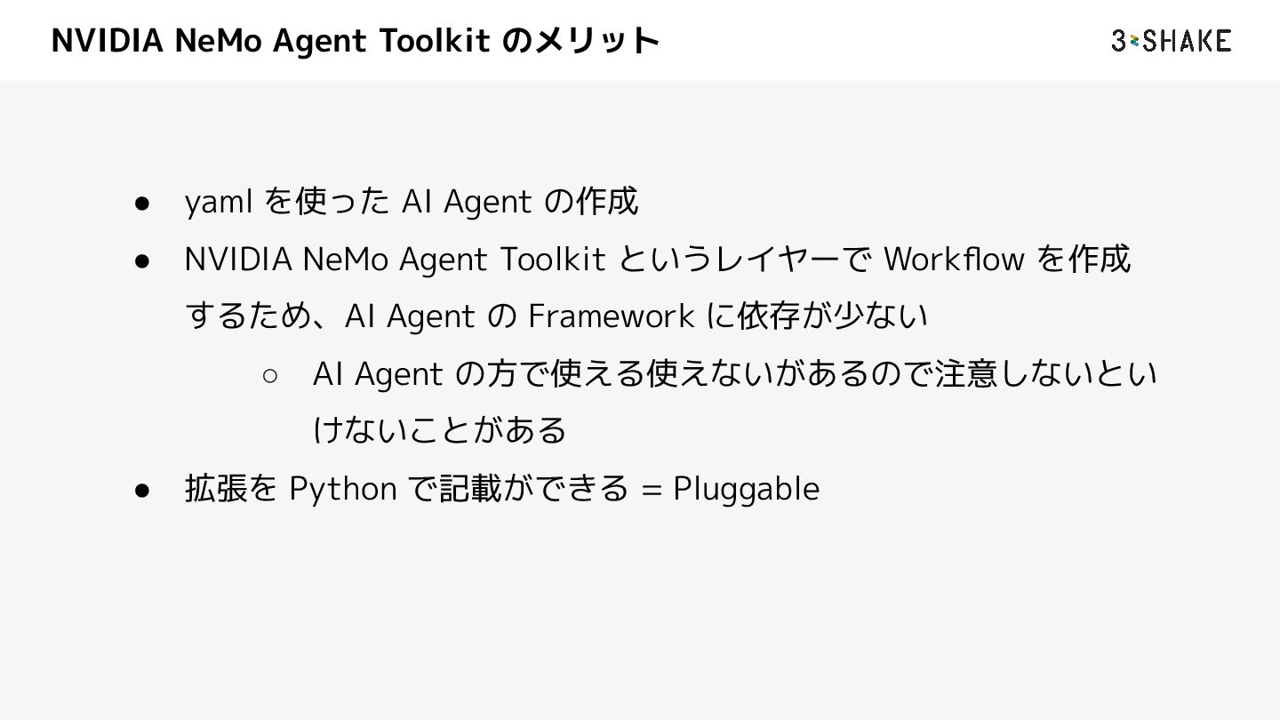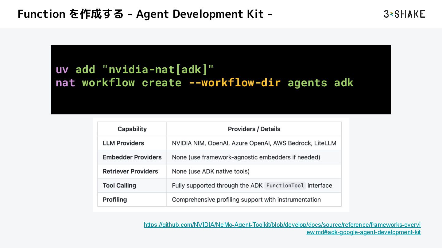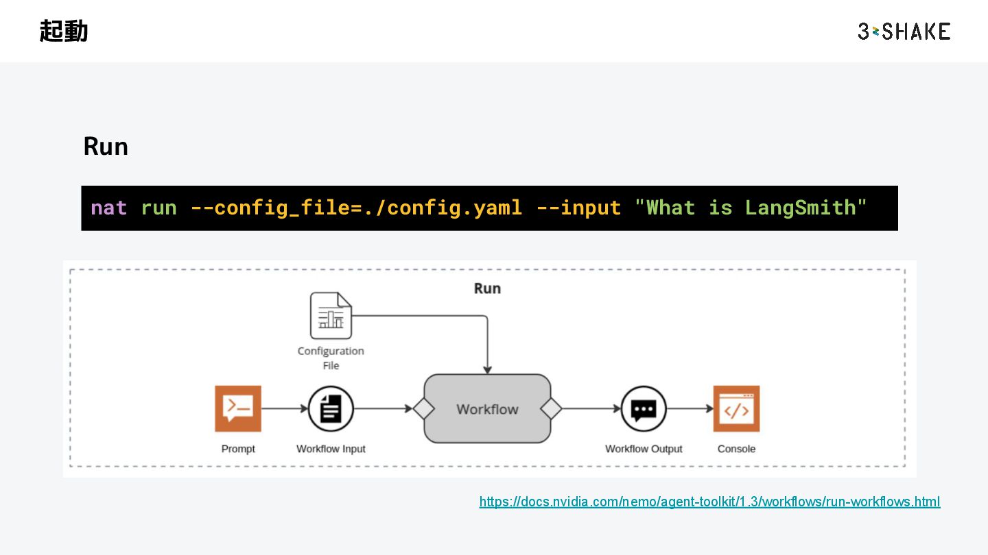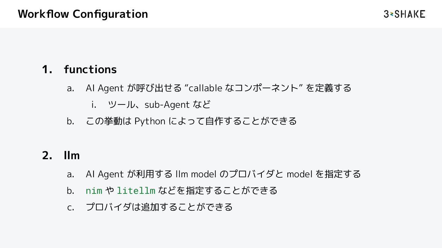 を定義する i. ツール、sub-Agent など b. この挙動は Python によって自作することができる 2. llm a. AI Agent が利用する llm model のプロバイダと model を指定する b. nim や litellm などを指定することができる c. プロバイダは追加することができる