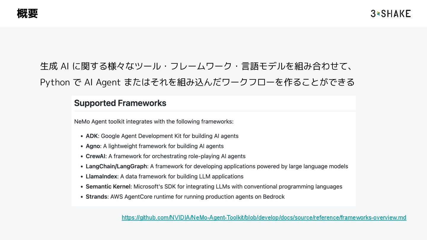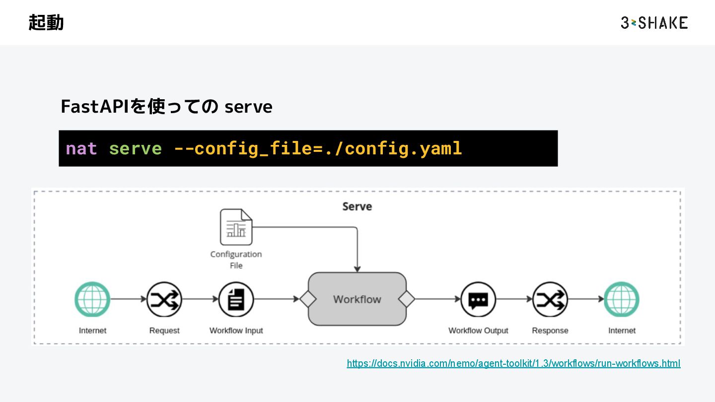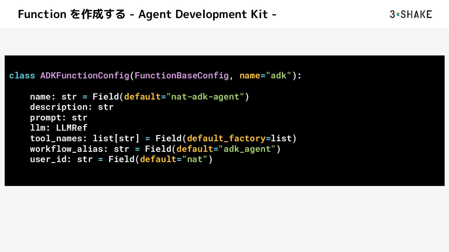 を定義する i. ツール、sub-Agent など b. この挙動は Python によって自作することができる 2. llm a. AI Agent が利用する llm model のプロバイダと model を指定する b. nim や litellm などを指定することができる c. プロバイダは追加することができる
