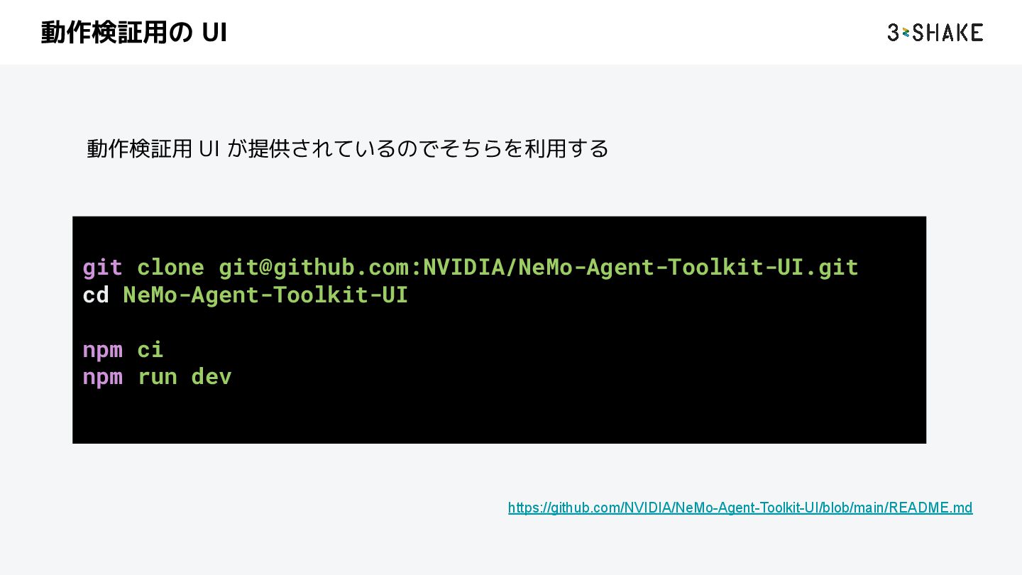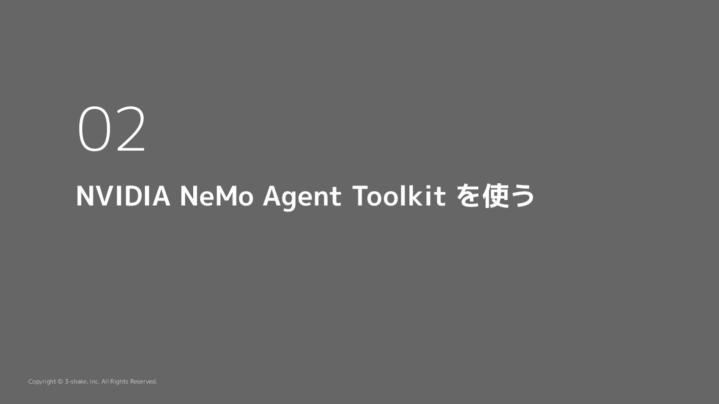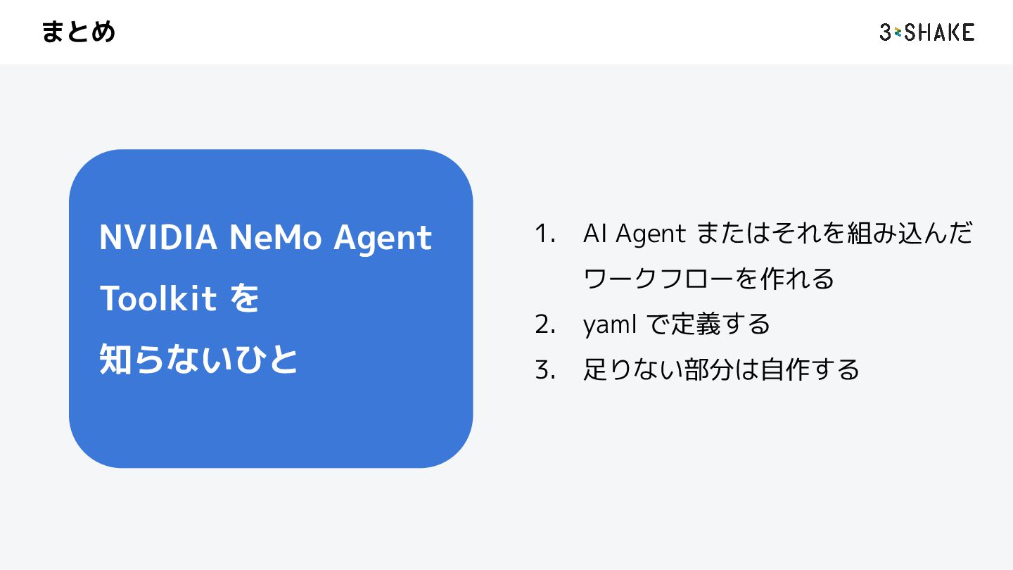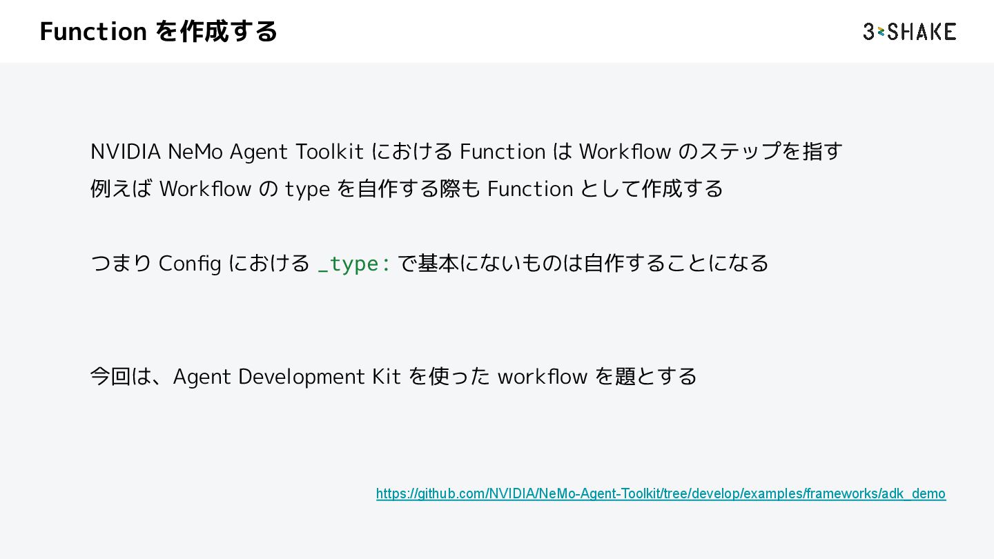 を定義する i. ツール、sub-Agent など b. この挙動は Python によって自作することができる 2. llm a. AI Agent が利用する llm model のプロバイダと model を指定する b. nim や litellm などを指定することができる c. プロバイダは追加することができる