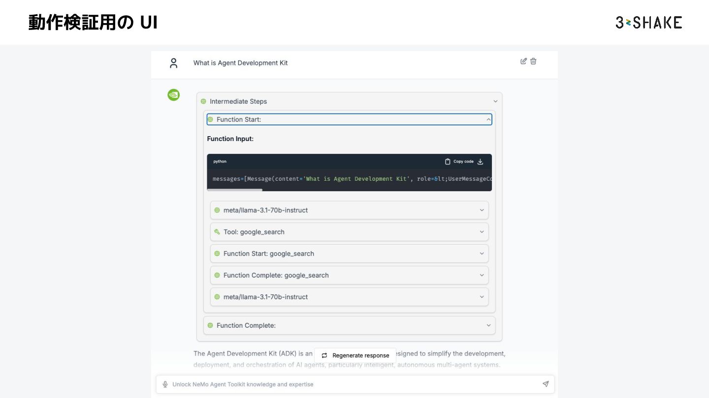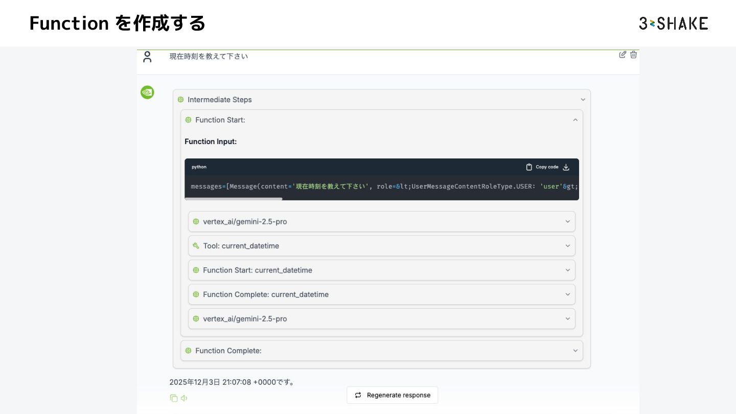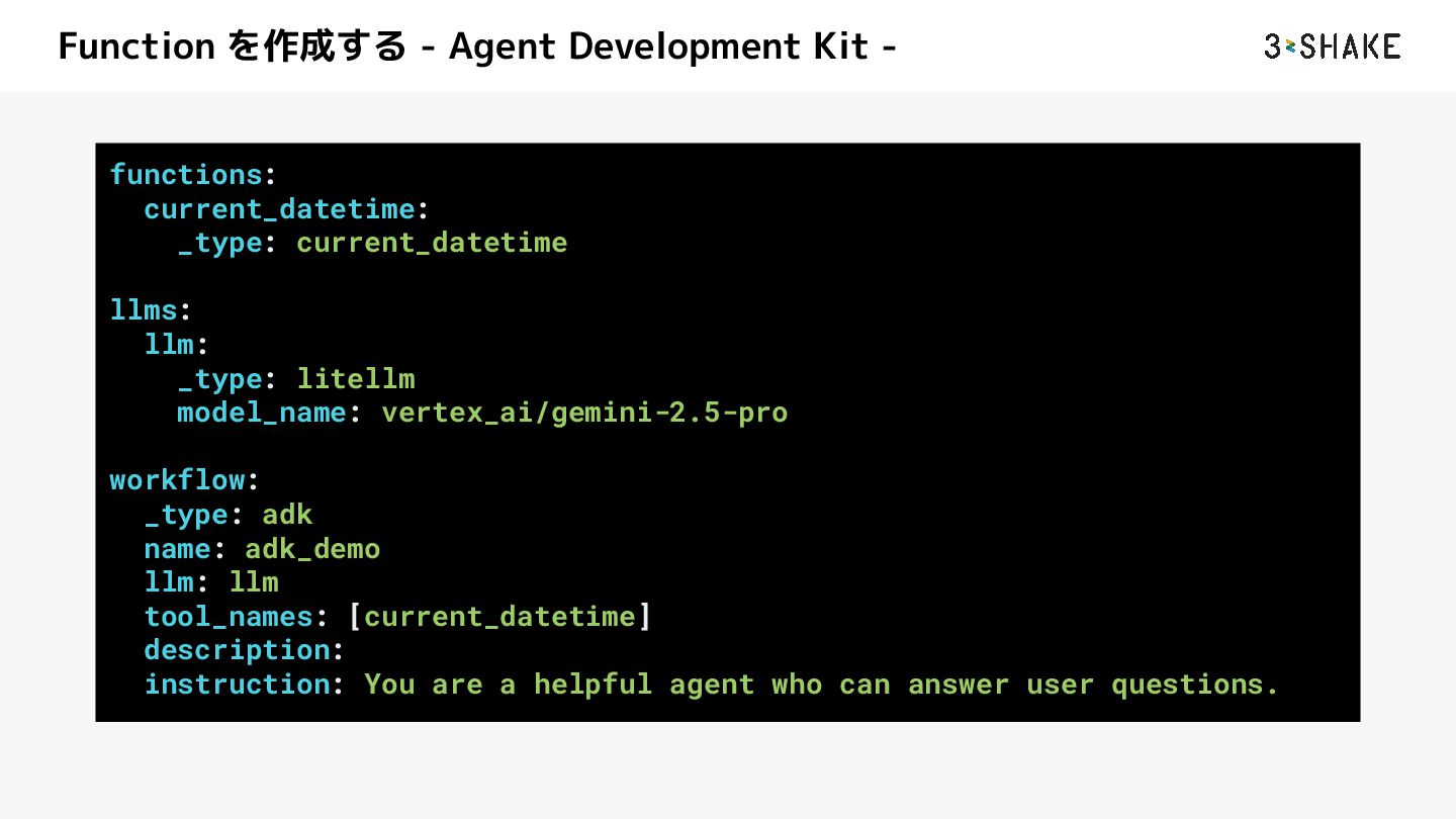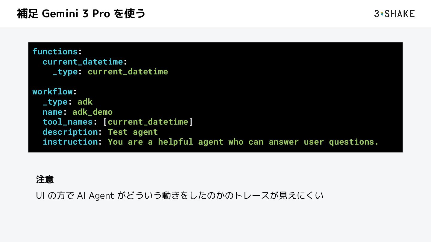 [current_datetime] description: Test agent instruction: You are a helpful agent who can answer user questions. 注意 UI の方で AI Agent がどういう動きをしたのかのトレースが見えにくい 補足 Gemini 3 Pro を使う
