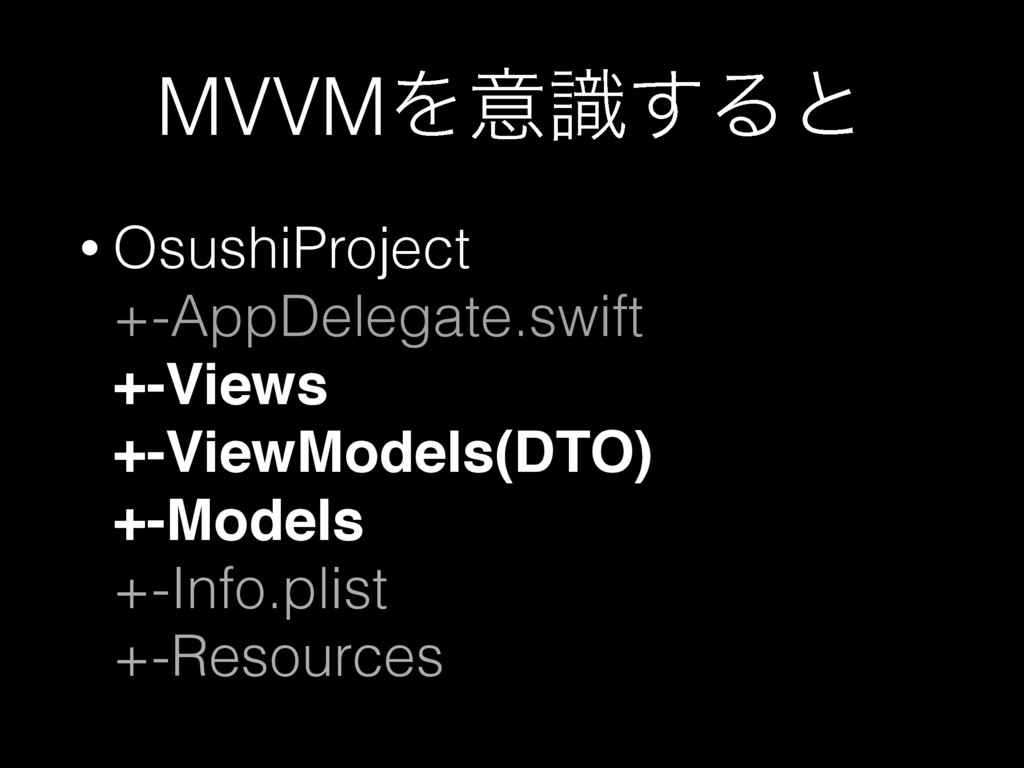 MVVMΛҙࣝ͢Δͱ • OsushiProject +-AppDelegate.swift +-Views +-ViewModels(DTO) +-Models +-Info.plist +-Resources