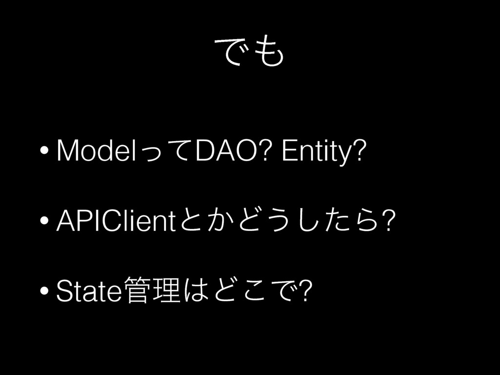 Ͱ • ModelͬͯDAO? Entity? • APIClientͱ͔Ͳ͏ͨ͠Β? • StateཧͲ͜Ͱ?
