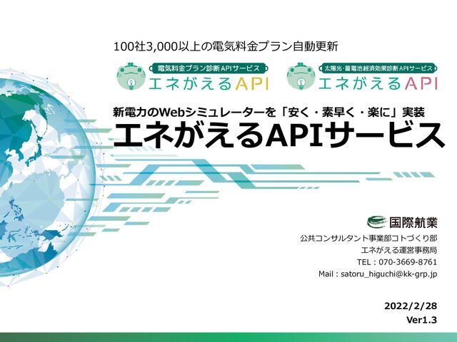 お問い合わせ ①導入相談・見積依頼 「エネがえるAPIの件」でお問い合わせください。 国際航業株式会社コトづくり部 樋口 悟まで Mail:[email protected] お急ぎ:070-3669-8761 URL:https://www.enegaeru.com ②オンライン会議による商談依頼 以下URLよりご都合の良い日程を登録ください。 Zoom(Web会議)URLが自動発行されます。 オンライン会議予約URL:https://bit.ly/satoruhiguchi