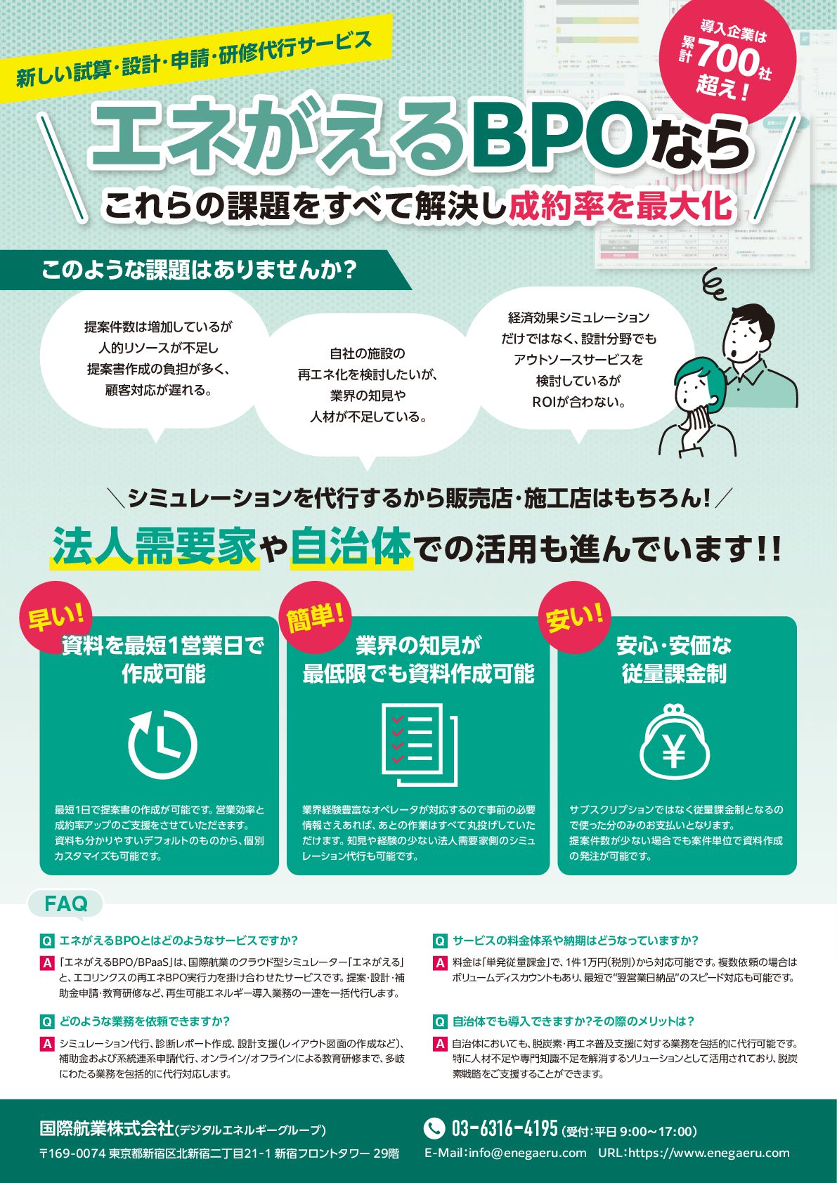 エネがえるBPOリーフレット 太陽光 蓄電池 経済効果試算代行(パネルレイアウト設計、補助金申請書作成、系統連系申請、現地調査・EPC・O&M、教育研修等様々な代行が可) 環境省、自治体、大手メーカー、販売施工店など多数実績あり。