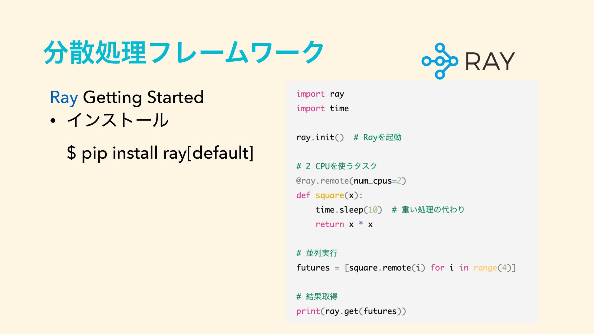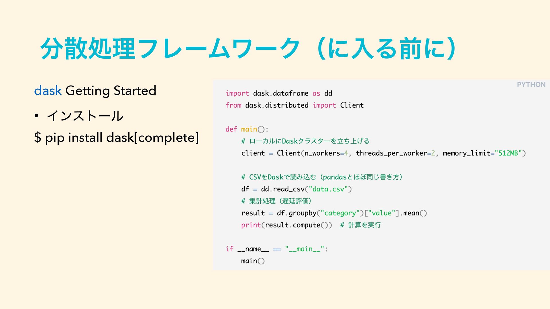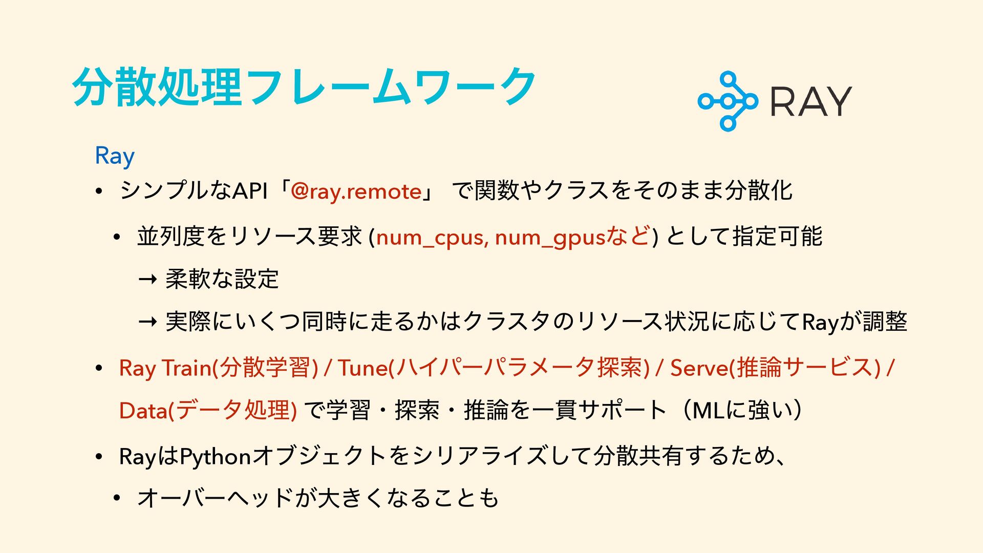 そんなときに役立つのが、Dask、Ray、Prefectなどの「分散処理」や「ワークフロー管理」に関わる様々な分散フレームワークたちです。