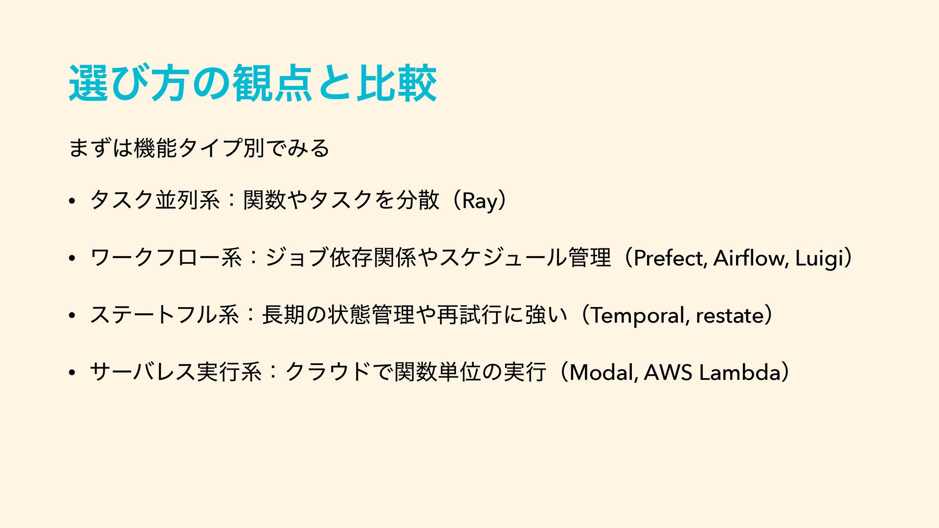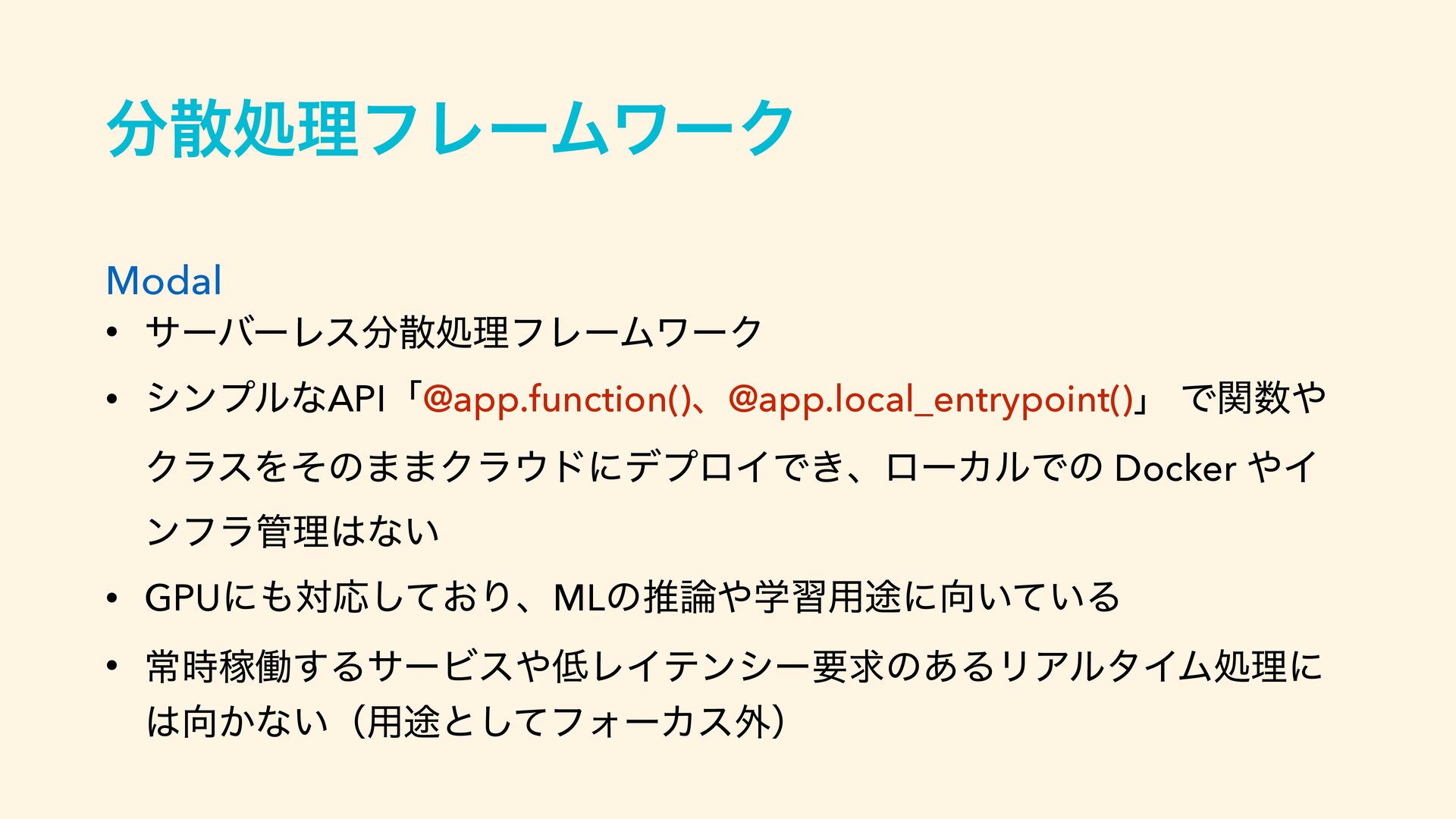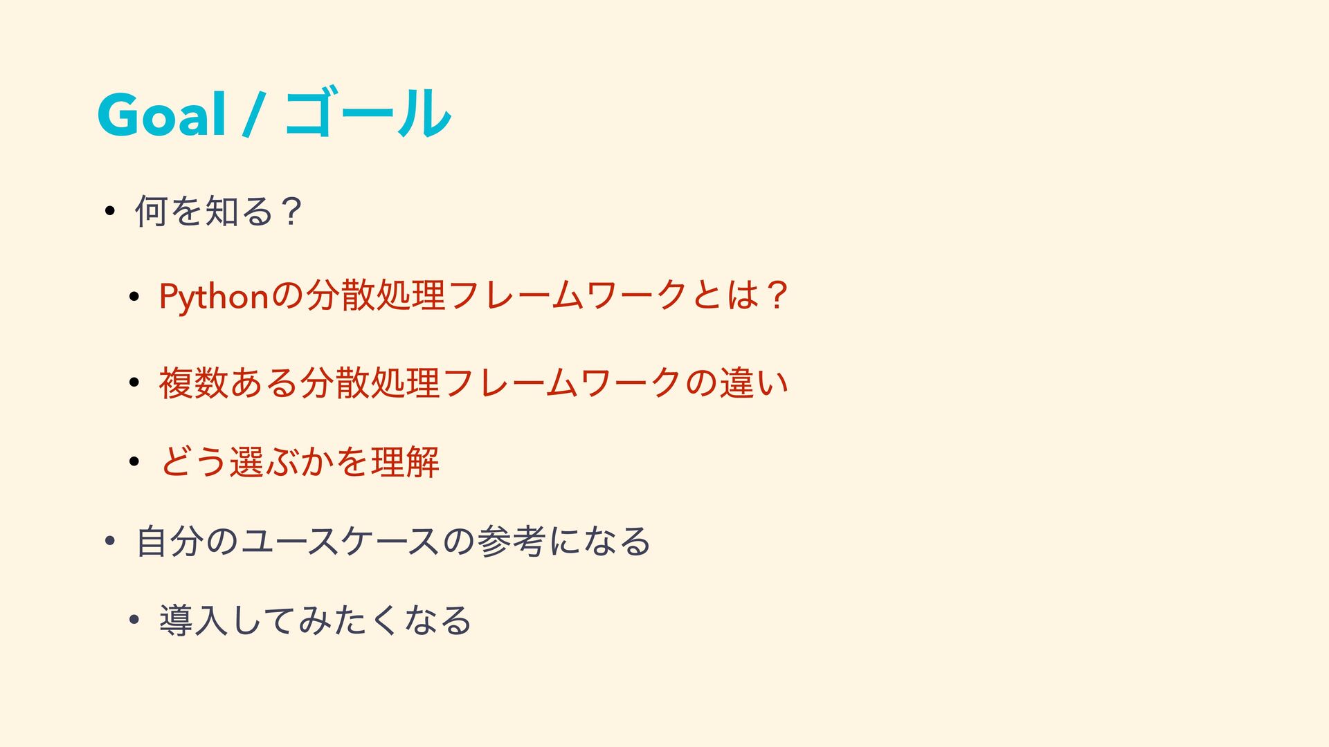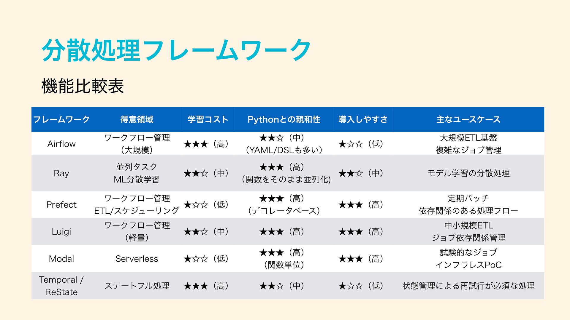 このトークでは、複数のPythonで利用可能な分散処理フレームワークの特徴を比較します。Pythonのコードをスケーラブルに・効率的に動かすための方法について紹介します。Ray、Prefect、Dask、Restateなどの他、用途別にどのような選択肢があり、何を基準に選べば良いのかを整理し、「とりあえずDask?」「Rayって何?」といった疑問を持つPythonユーザーのために、「選び方」を共有します。