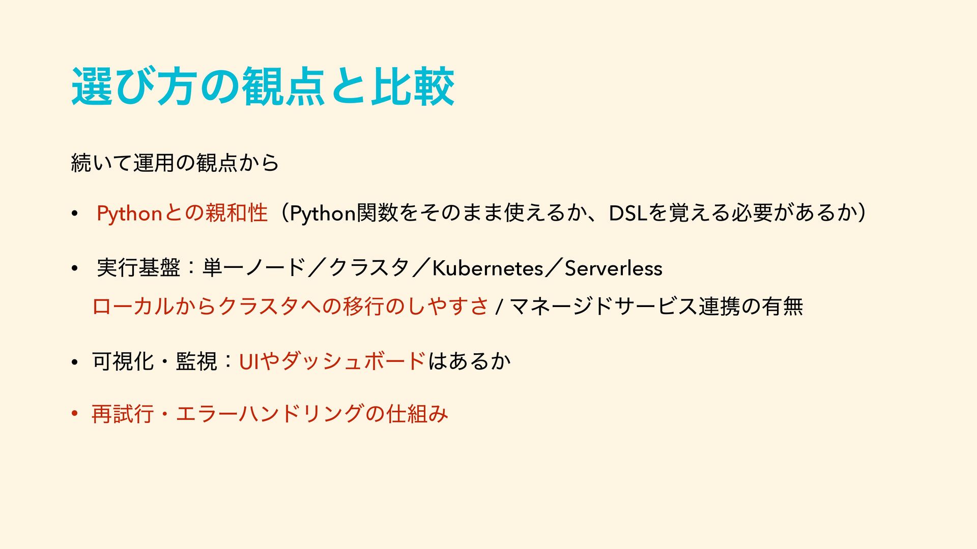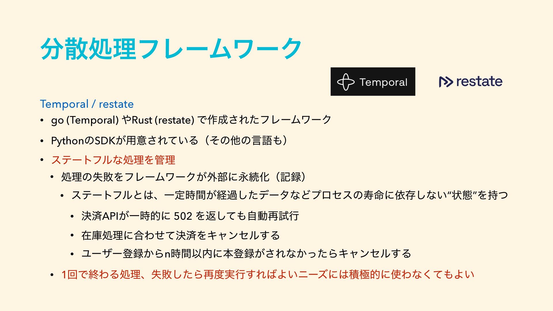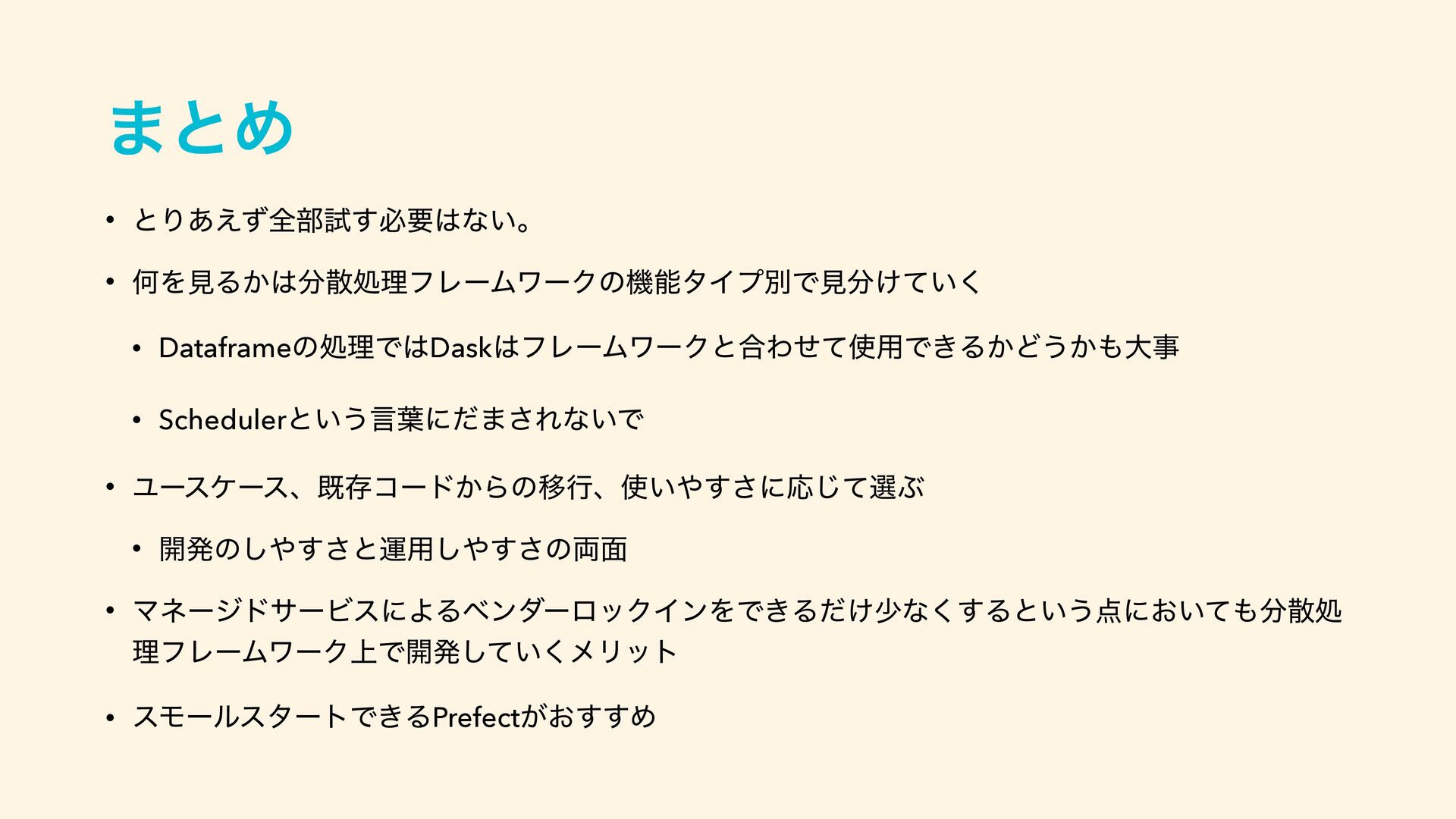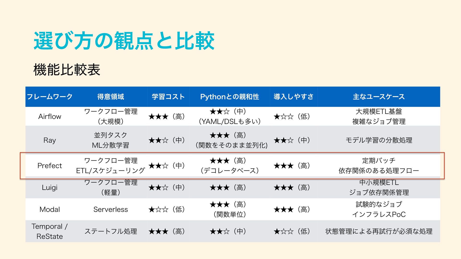 このトークでは、複数のPythonで利用可能な分散処理フレームワークの特徴を比較します。Pythonのコードをスケーラブルに・効率的に動かすための方法について紹介します。Ray、Prefect、Dask、Restateなどの他、用途別にどのような選択肢があり、何を基準に選べば良いのかを整理し、「とりあえずDask?」「Rayって何?」といった疑問を持つPythonユーザーのために、「選び方」を共有します。