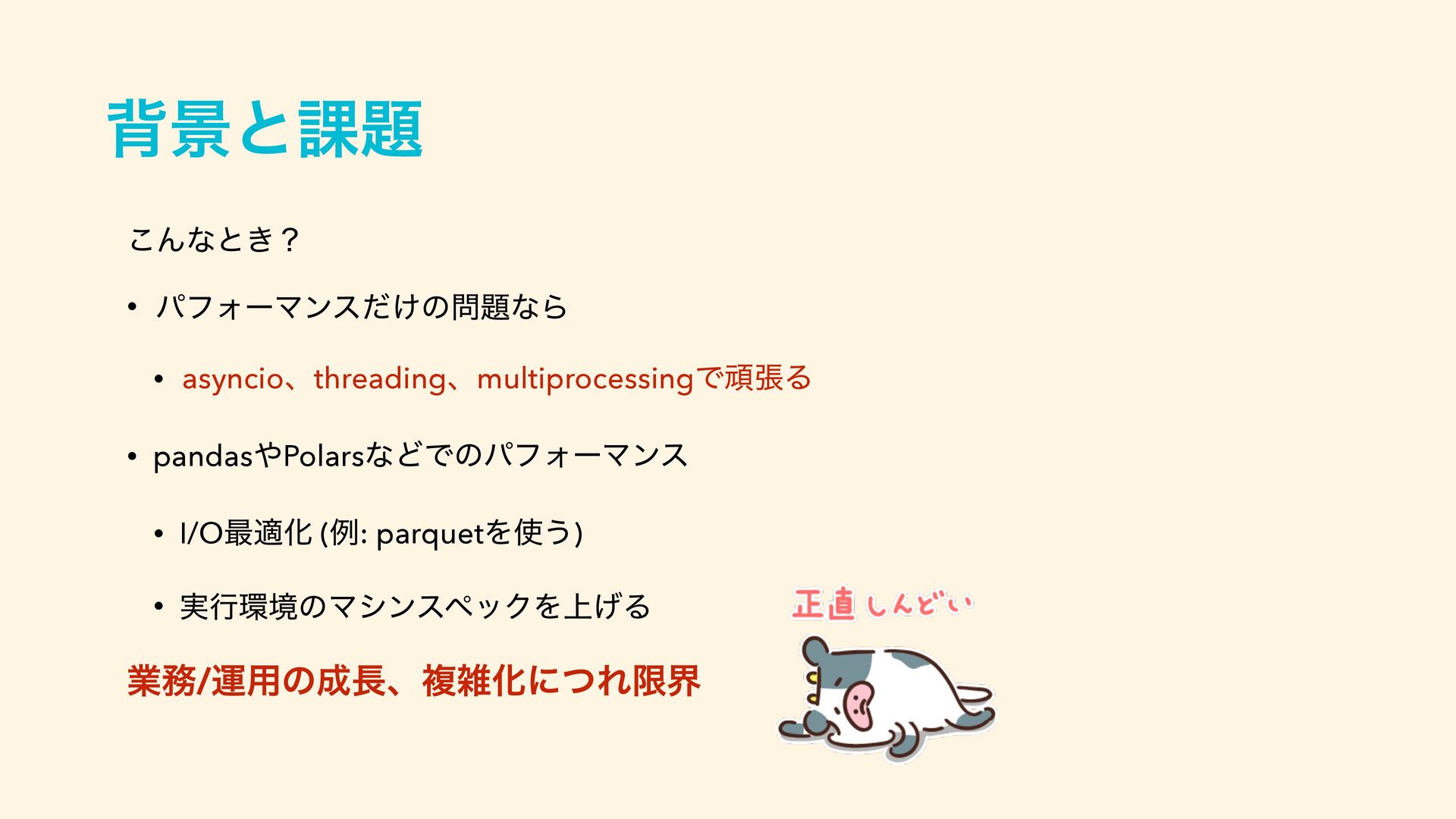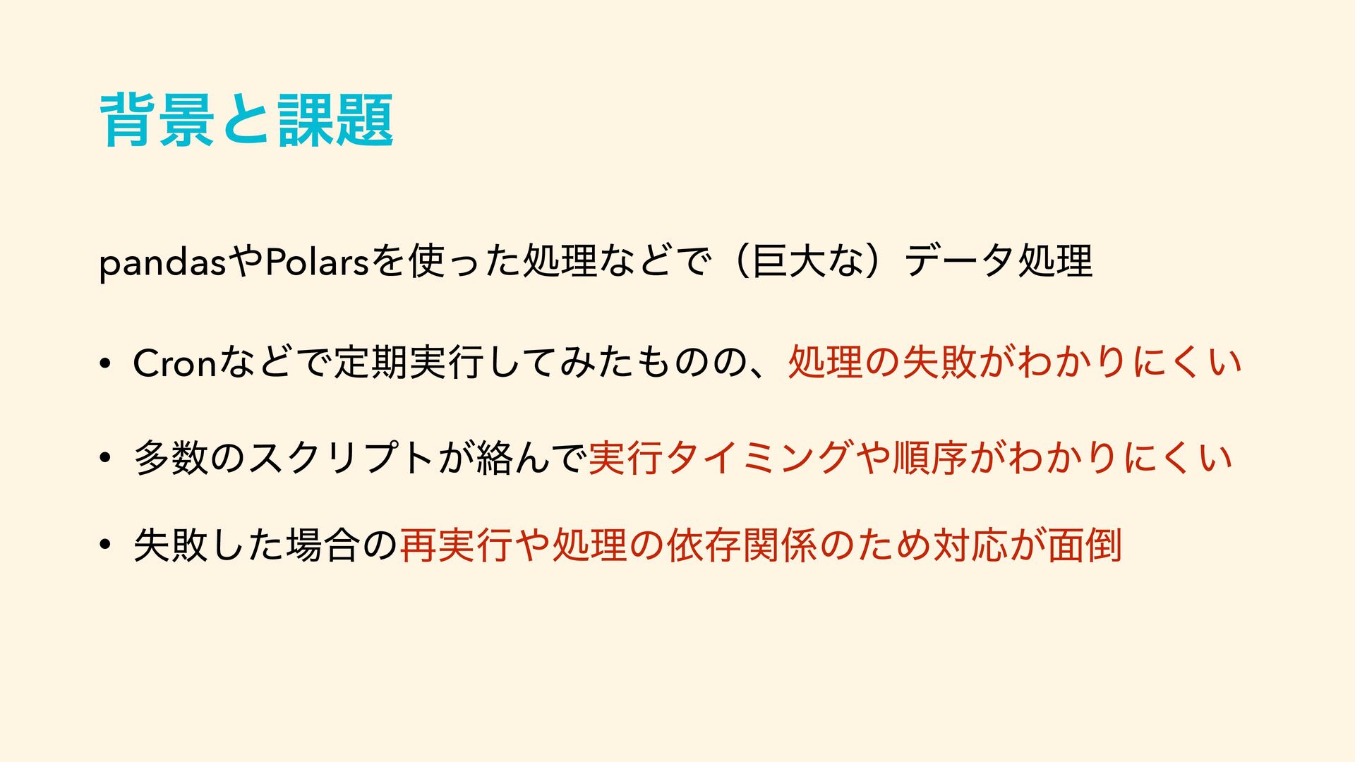 Pythonでデータ処理を行うとき、pandasやpolarsのようなライブラリ群を使う人は多いと思います。また、これらのライブラリにこだわらずPythonスクリプト「効率よくスケールさせたい」、「定期的に動かしたい」と考えたことはありませんか?