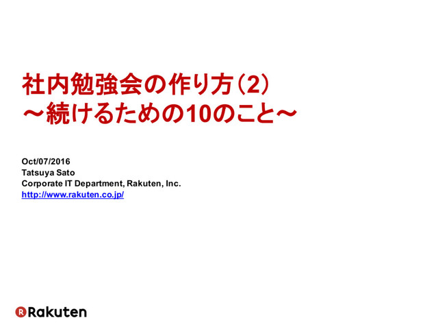 社内勉強会の作り方(2) 〜続けるための10のこと〜 Oct/07/2016 Tatsuya Sato Corporate IT Department, Rakuten, Inc.