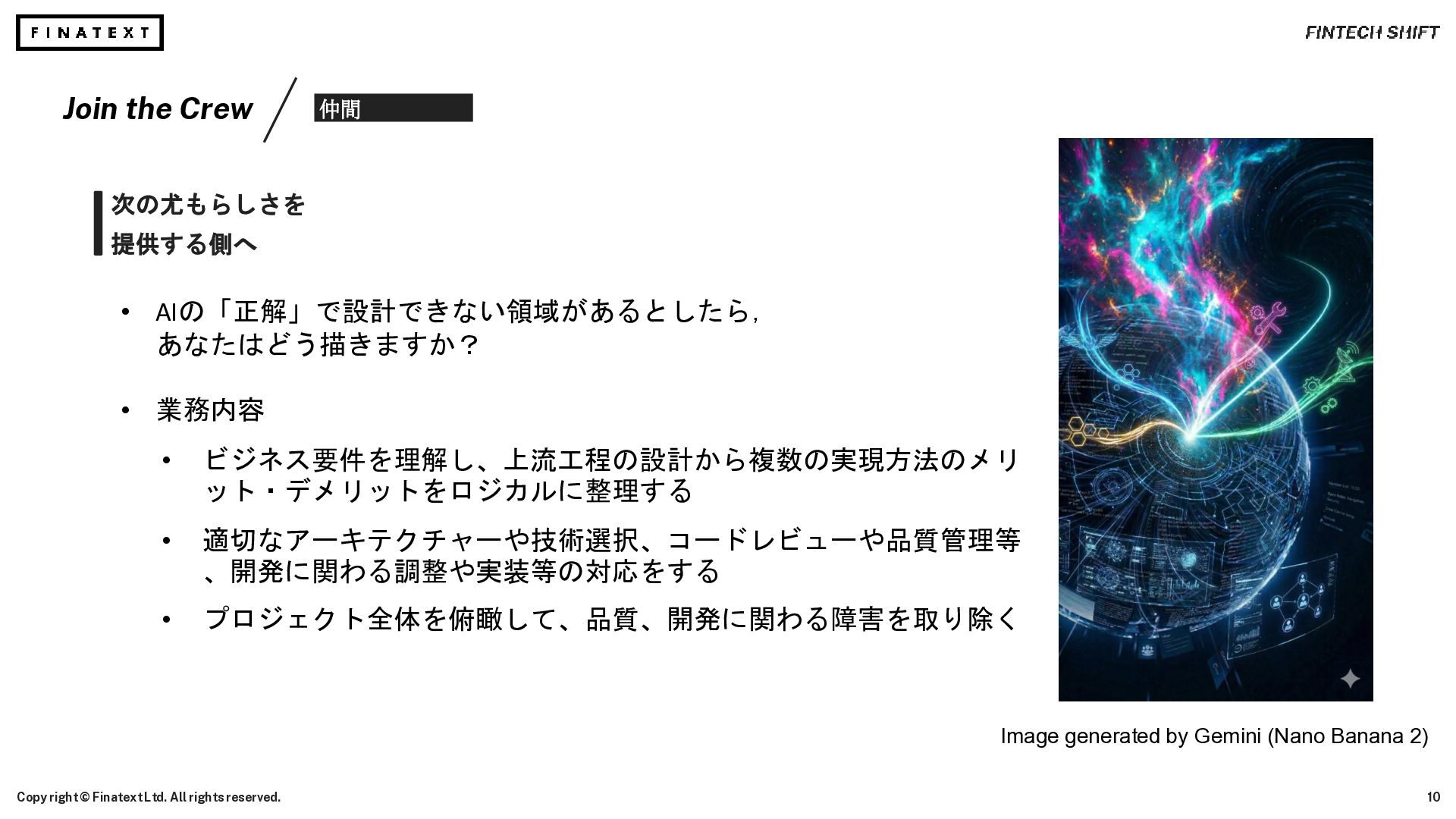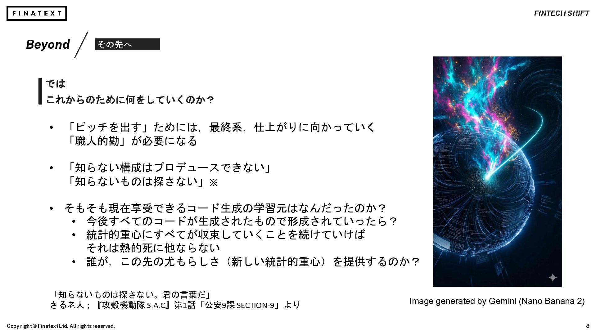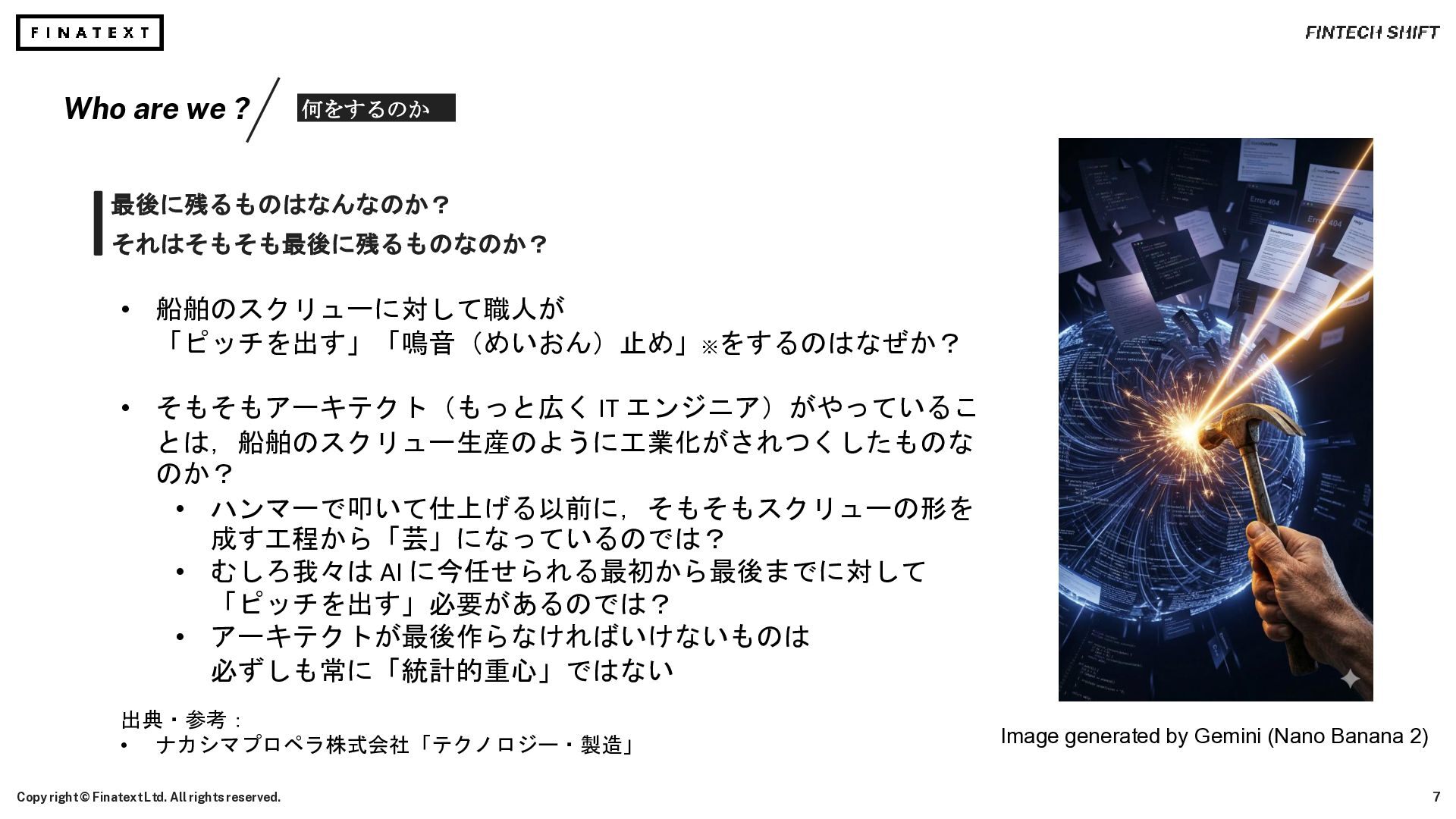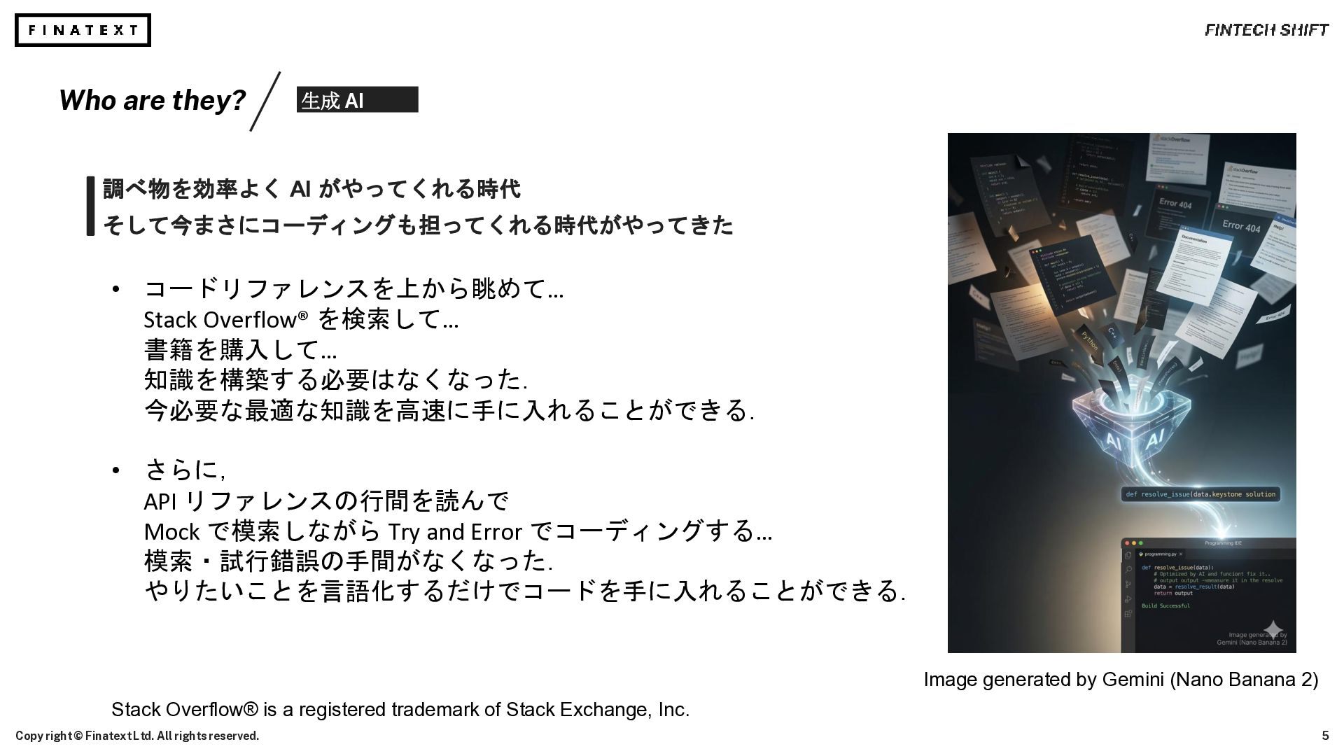 Ltd. All rights reserved. Image generated by Gemini (Nano Banana 2) 調べ物を効率よく AI がやってくれる時代 そして今まさにコーディングも担ってくれる時代がやってきた • コードリファレンスを上から眺めて… Stack Overflow® を検索して… 書籍を購入して… 知識を構築する必要はなくなった. 今必要な最適な知識を高速に手に入れることができる. • さらに, API リファレンスの行間を読んで Mock で模索しながら Try and Error でコーディングする… 模索・試行錯誤の手間がなくなった. やりたいことを言語化するだけでコードを手に入れることができる. Stack Overflow® is a registered trademark of Stack Exchange, Inc.