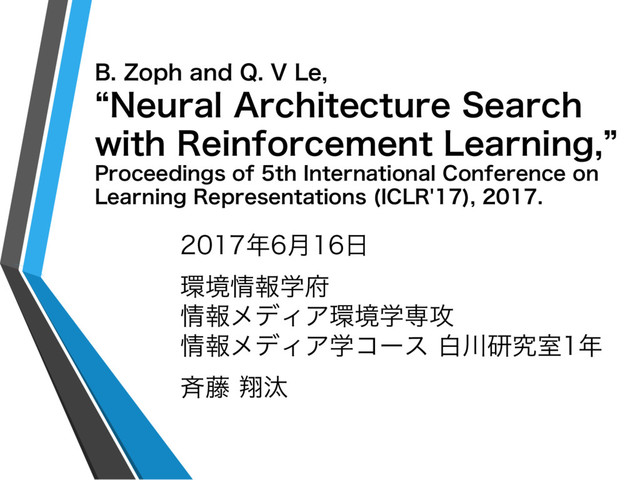 ・B. Zoph and Q. V Le, “Neural Architecture Search with Reinforcement Learning,” Proceedings of 5th International Conference on Learning Representations (ICLR'17), 2017.