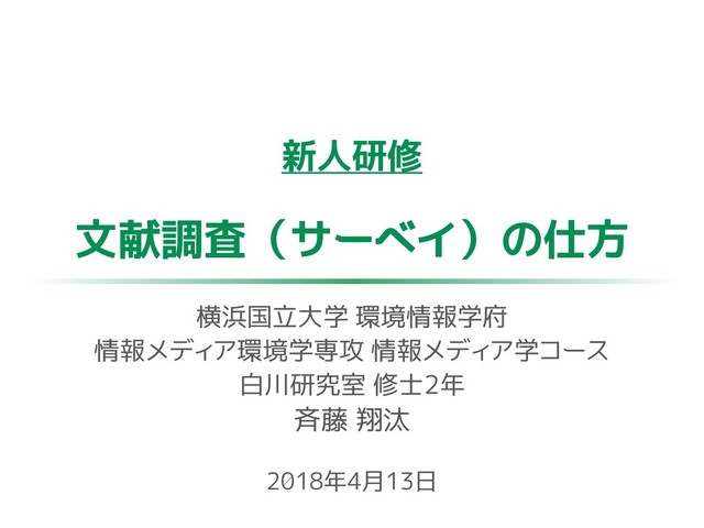 横浜国立大学 環境情報学府 情報メディア環境学専攻 情報メディア学コース 白川研究室 修士2年 斉藤 翔汰 2018年4月13日 新人研修