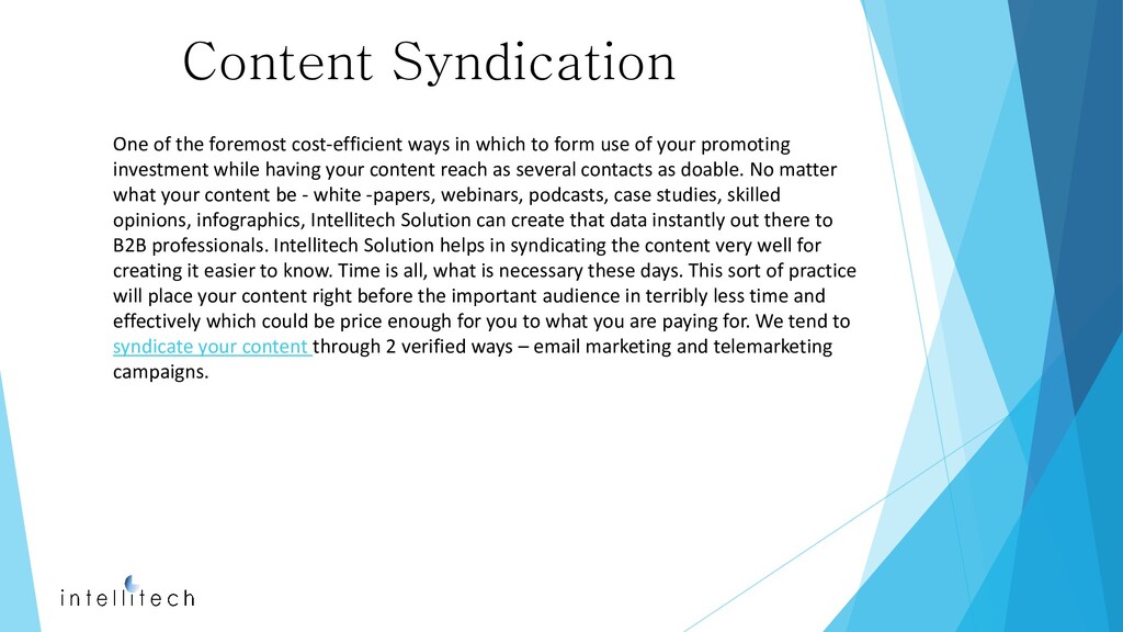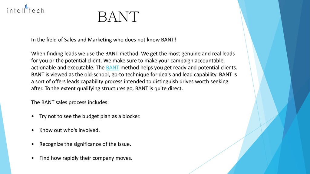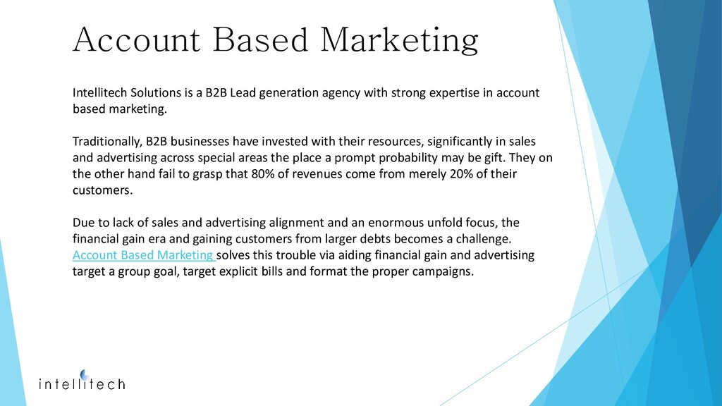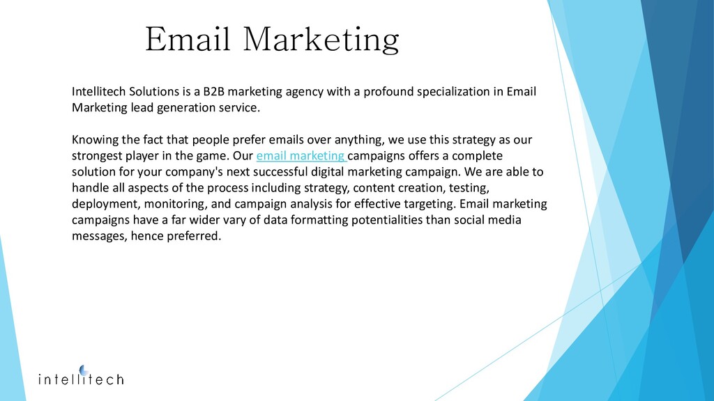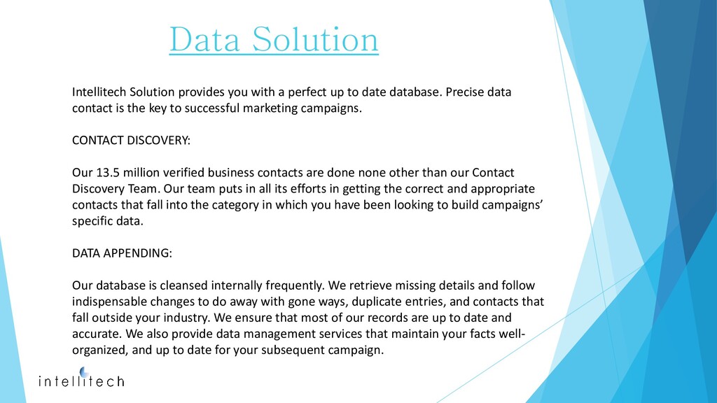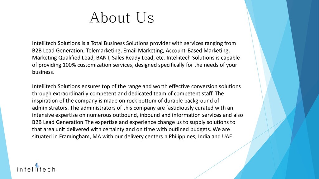 Intellitech Solutions is a Total Business Solutions provider with services ranging from B2B Lead Generation, Telemarketing, Email Marketing, Account-Based Marketing, Marketing Qualified Lead, BANT, Sales Ready Lead, etc.