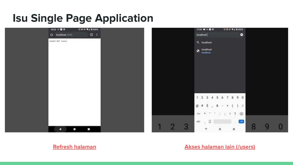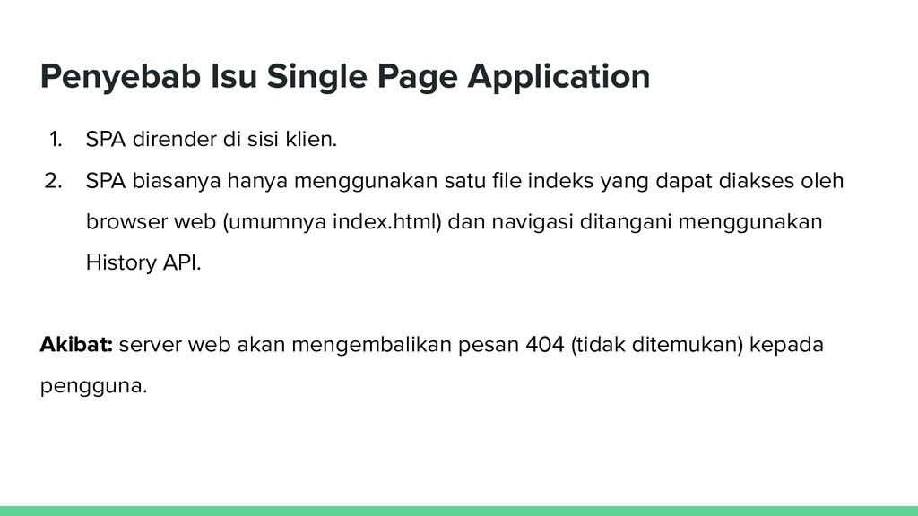 klien. 2. SPA biasanya hanya menggunakan satu file indeks yang dapat diakses oleh browser web (umumnya index.html) dan navigasi ditangani menggunakan History API. Akibat: server web akan mengembalikan pesan 404 (tidak ditemukan) kepada pengguna.