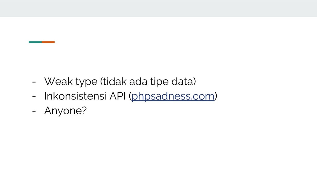 - Weak type (tidak ada tipe data) - Inkonsistensi API