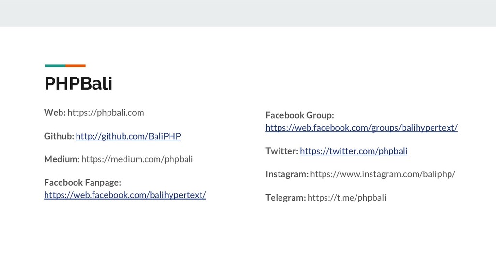 PHPBali Web: https://phpbali.com Github: http://github.com/BaliPHP Medium: https://medium.com/phpbali Facebook Fanpage: https://web.facebook.com/balihypertext/