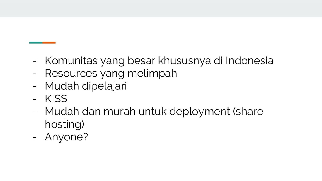 melimpah - Mudah dipelajari - KISS - Mudah dan murah untuk deployment (share hosting) - Anyone?