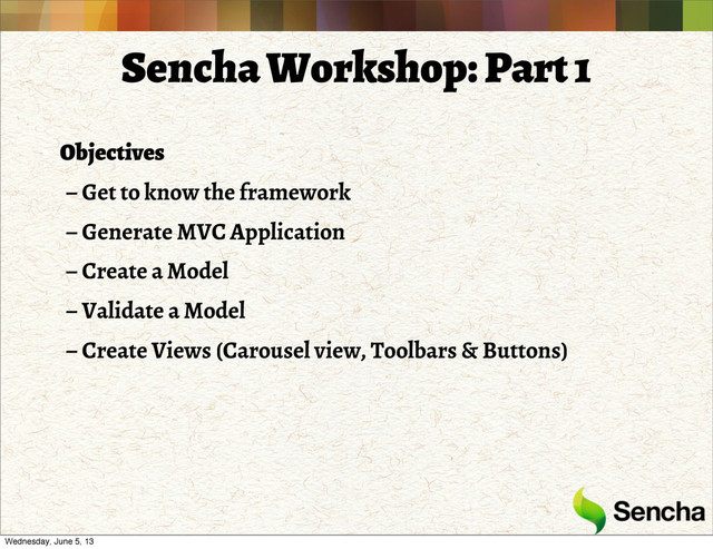 supported validations. Ext.define('MyApp.model.User', { extend: 'Ext.data.Model', config: { idProperty: 'idUser', fields: [ {name: 'idUser', type: 'int'}, {name: 'name', type: 'string'}, {name: 'age', type: 'int'}, 'phone', 'gender', 'username', {name: 'alive', type: 'boolean', defaultValue: true} ], validations: [ {type: 'presence', field: 'age', message: 'Age is Reqd'}, {type: 'length', field: 'name', min: 2}, {type: 'inclusion',field: 'gender', list: ['Male', 'Female']}, {type: 'exclusion', field: 'username', list: ['Admin', 'Operator']}, {type: 'format', field: 'username', matcher: /([a-z]+)[0-9]{2,3}/, } ] } }); Wednesday, June 5, 13