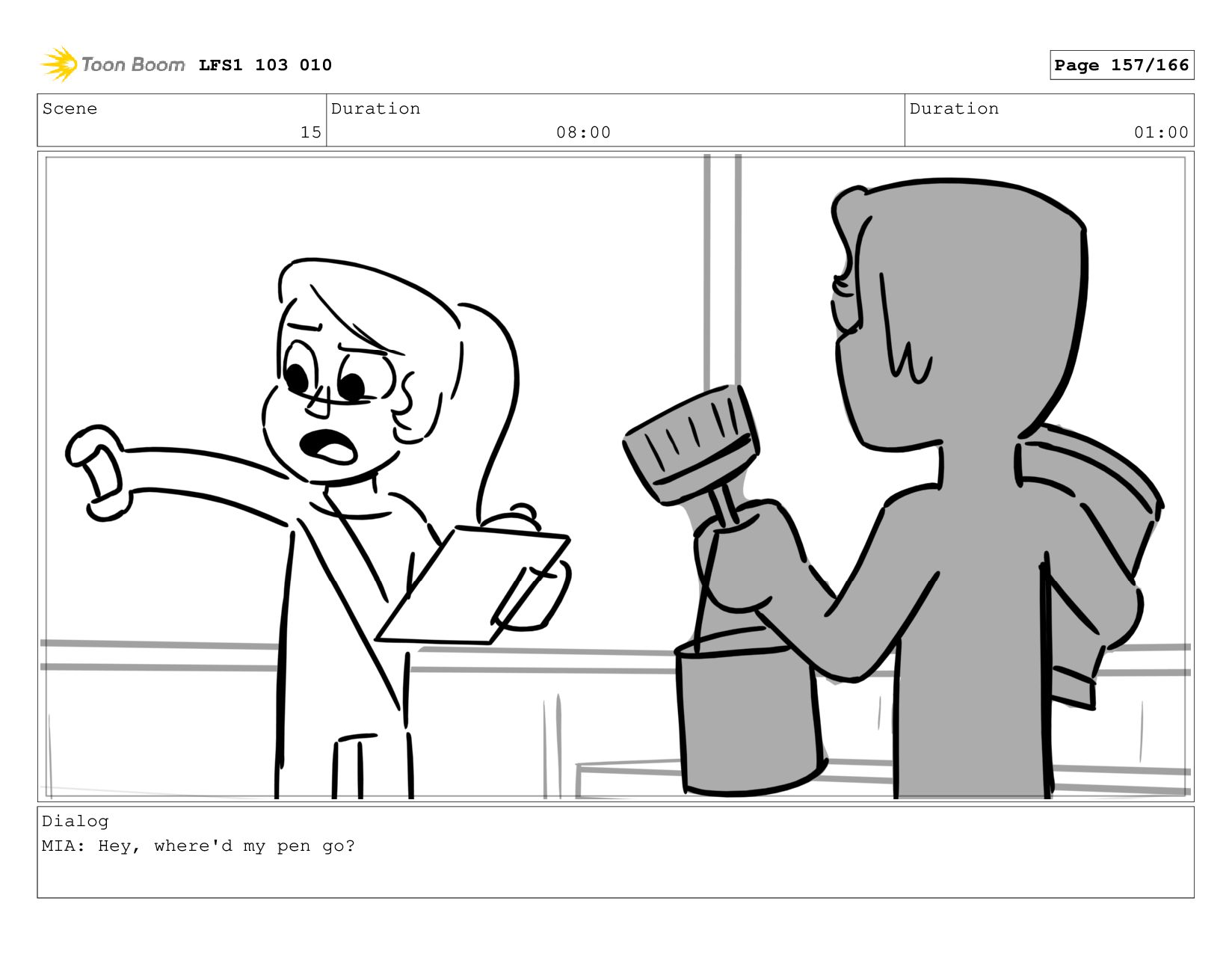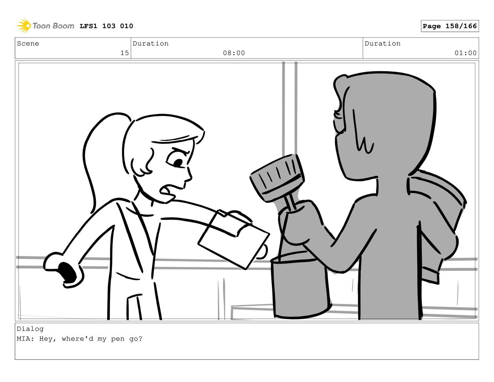Scene 15 Duration 08:00 Duration 01:00 Dialog MIA: Hey, where'd