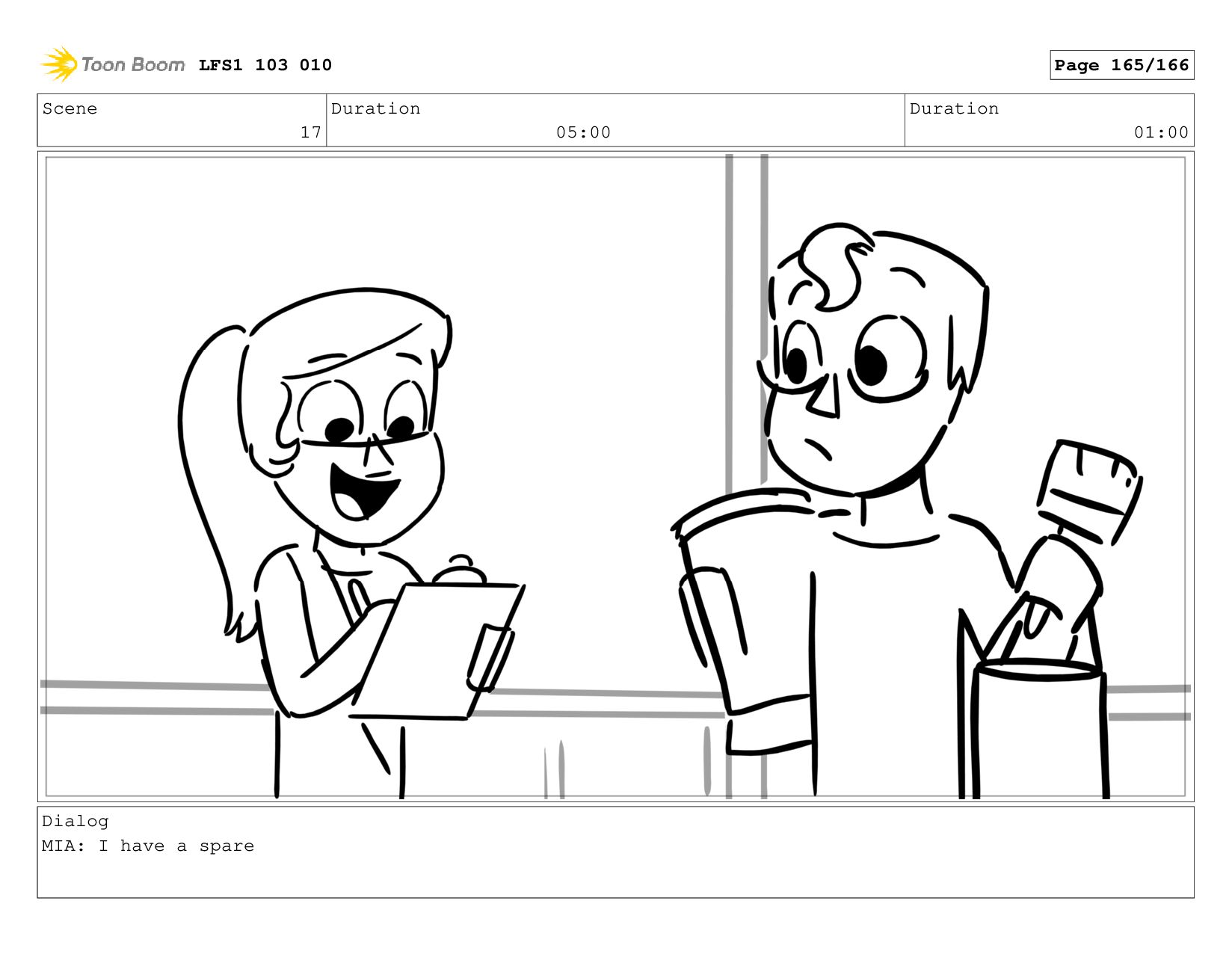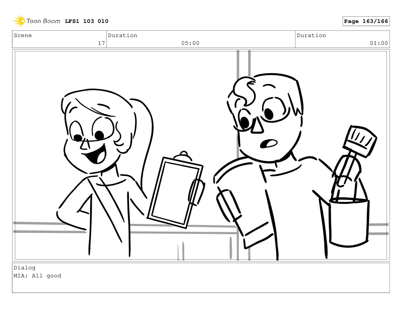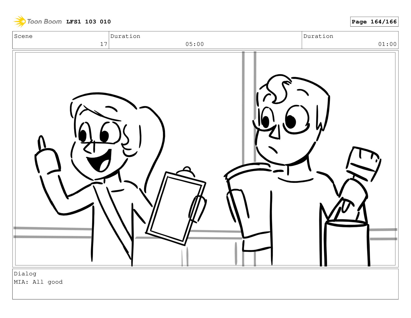 Scene 17 Duration 05:00 Duration 01:00 Dialog MIA: All good