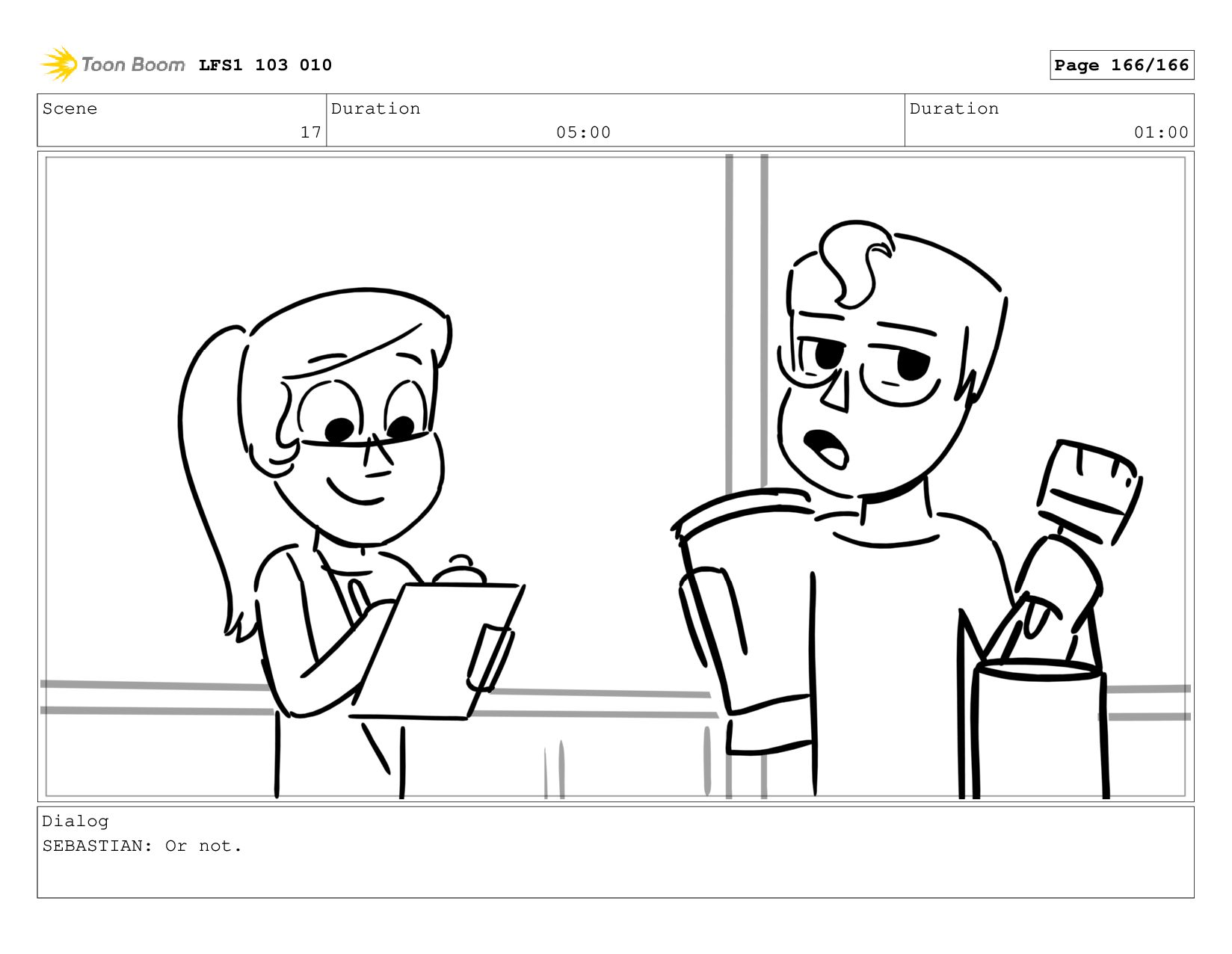 Scene 17 Duration 05:00 Duration 01:00 Dialog SEBASTIAN: Or not.