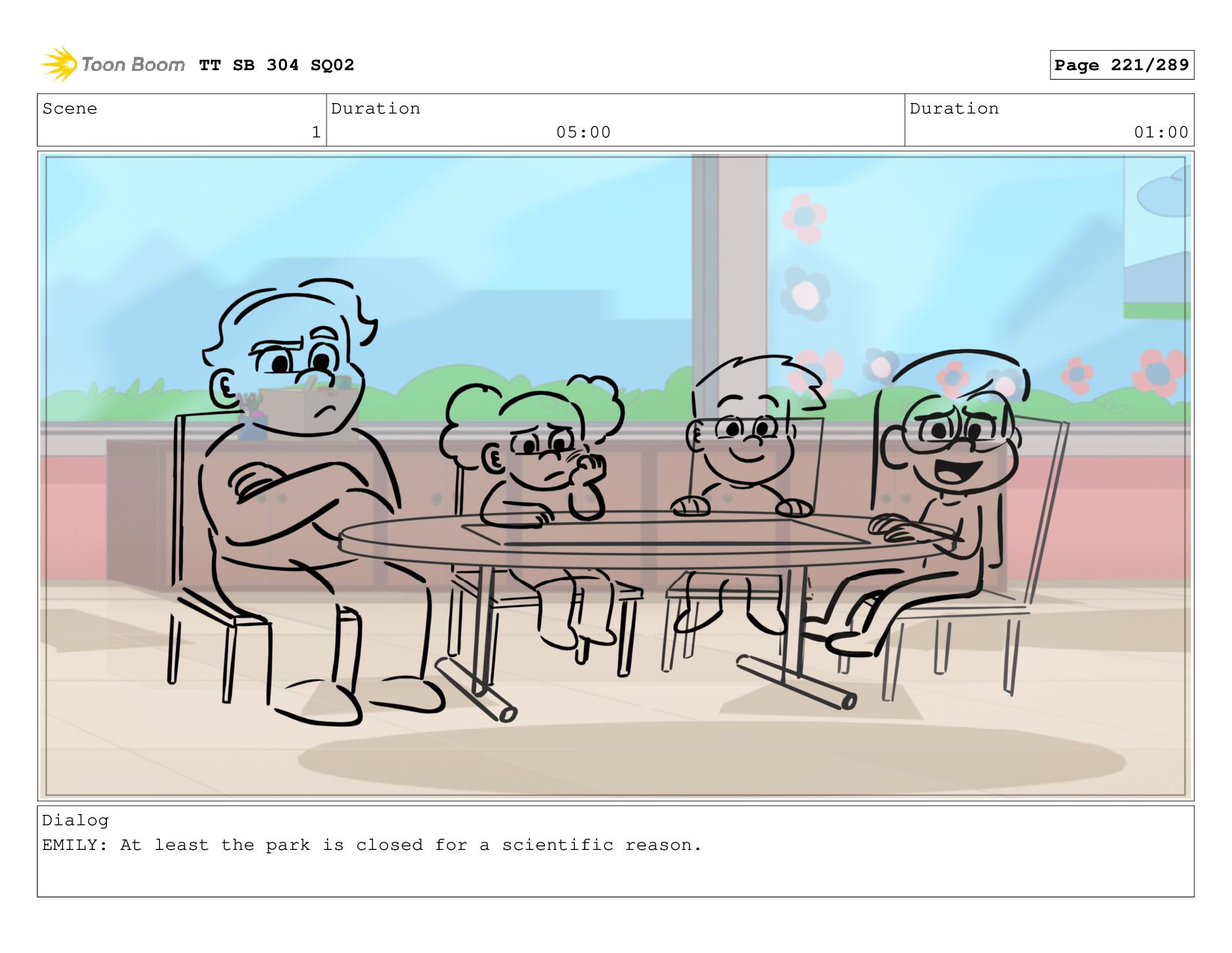 Scene 1 Duration 05:00 Duration 01:00 Dialog EMILY: At least
