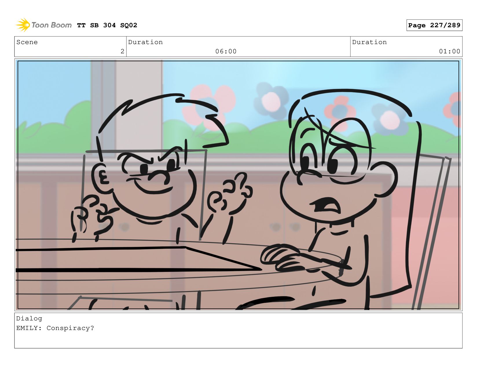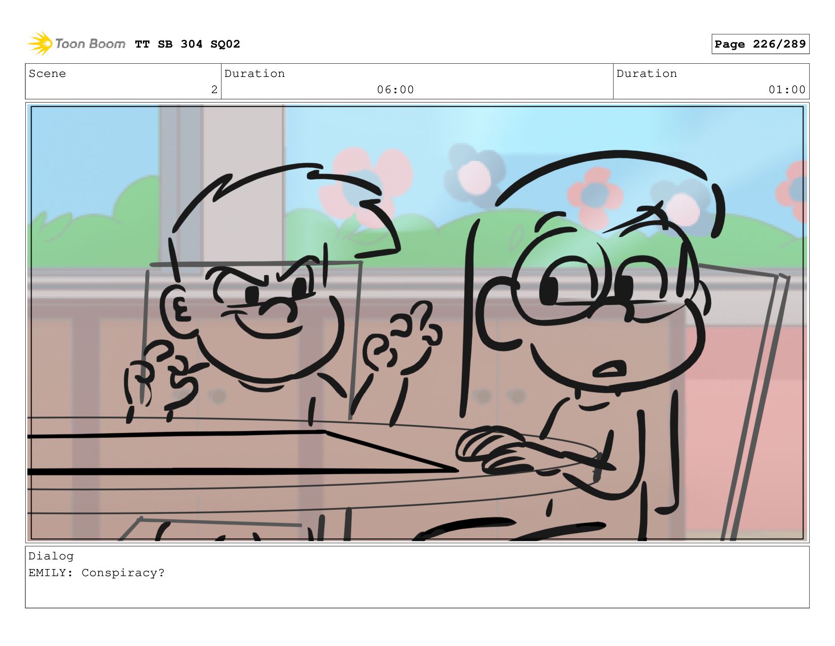 Scene 2 Duration 06:00 Duration 01:00 Dialog EMILY: Conspiracy? TT