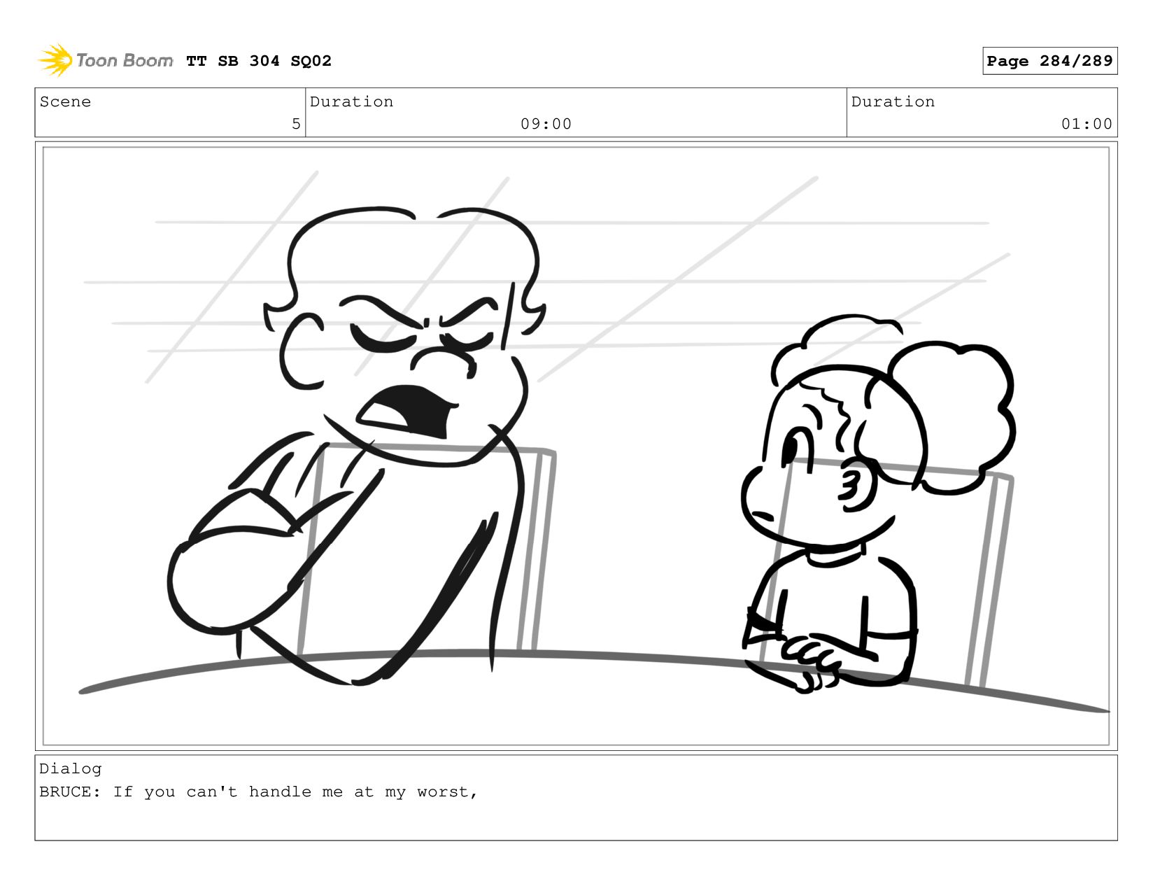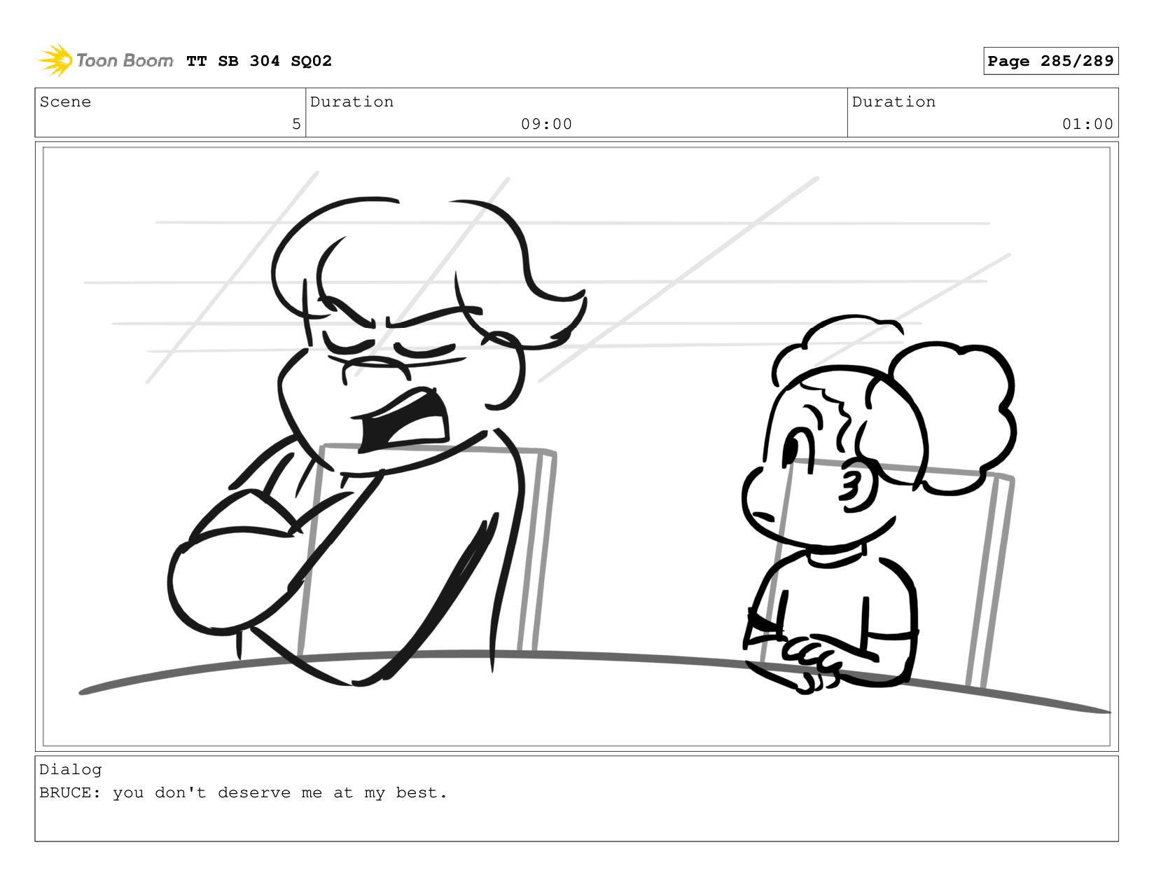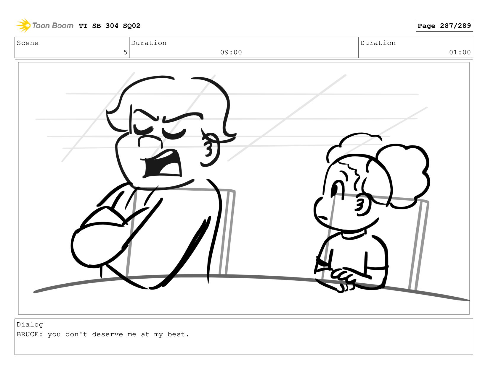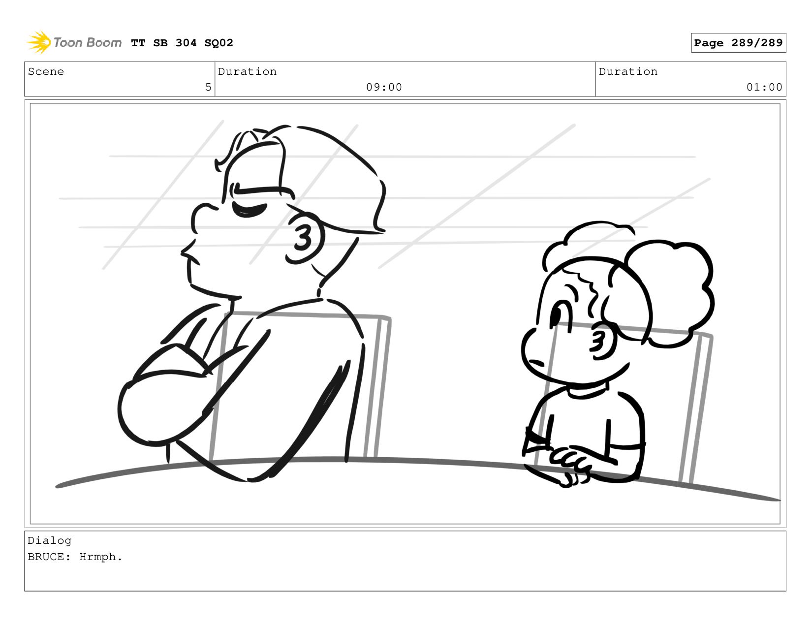 Scene 5 Duration 09:00 Duration 01:00 Dialog BRUCE: Hrmph. TT